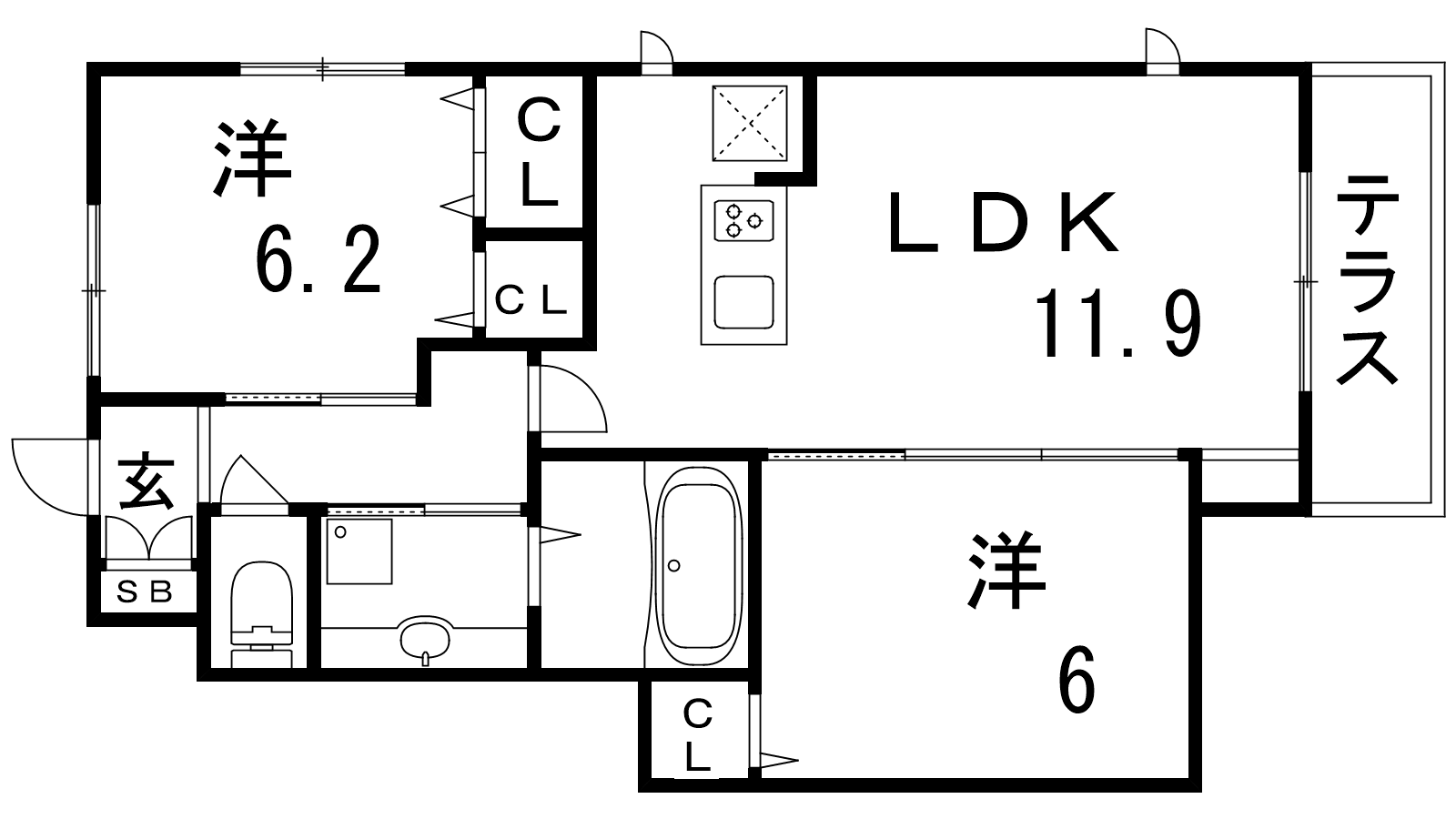 - LDK11.9帖、洋室6.2帖、洋室6帖