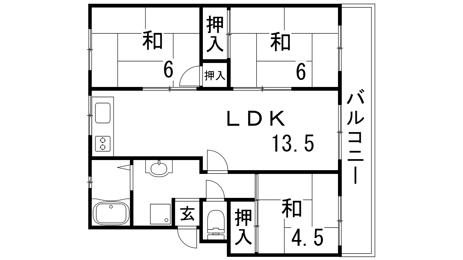 - LDK13.5帖、和室6帖、和室6帖、和室4.5帖