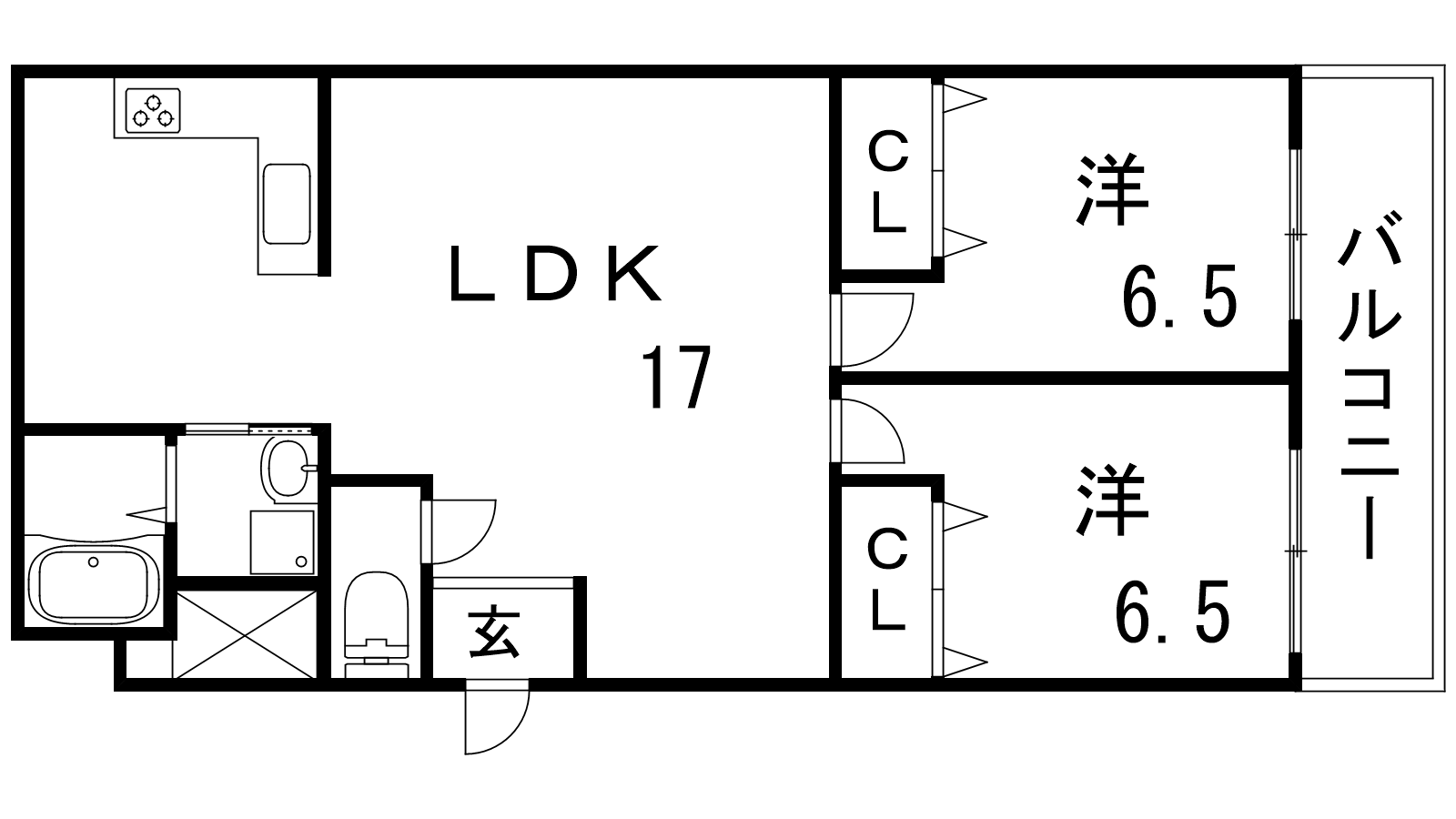 - LDK17帖、洋室6.5帖、洋室6.5帖
