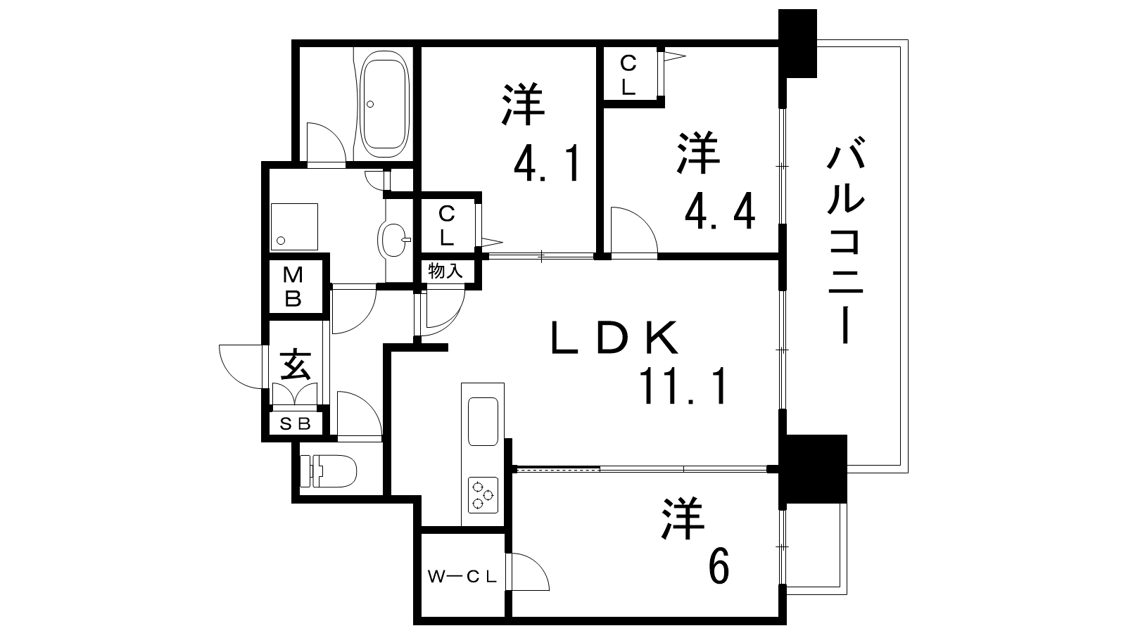 - LDK11.1帖、洋室6帖、洋室4.1帖、洋室4.4帖