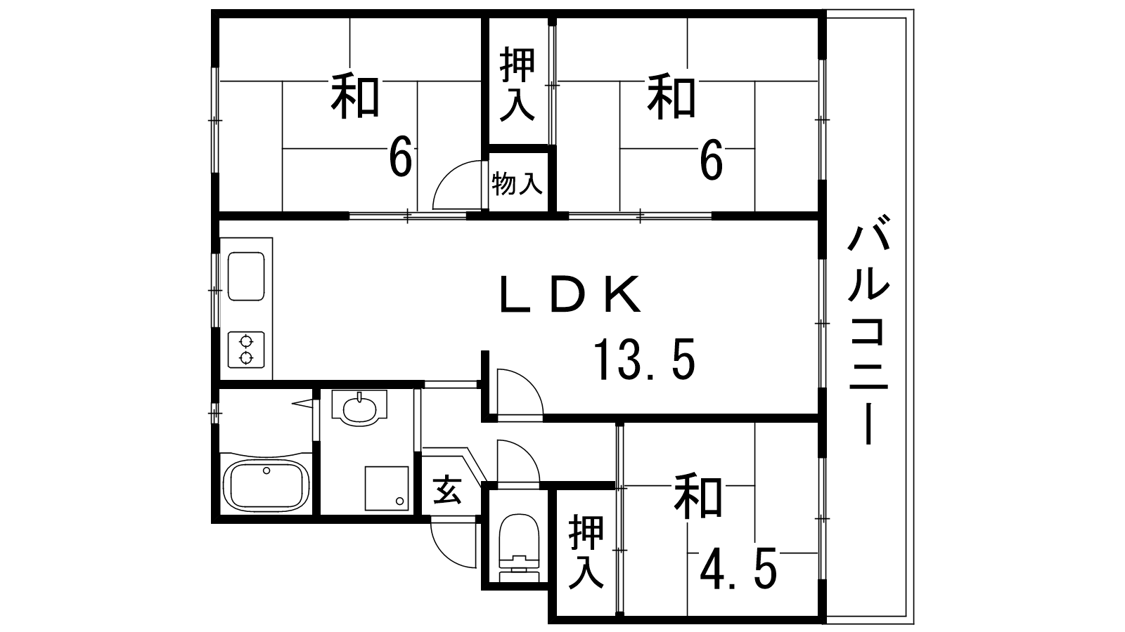 - LDK13.5帖、和室6帖、和室6帖、和室4.5帖
