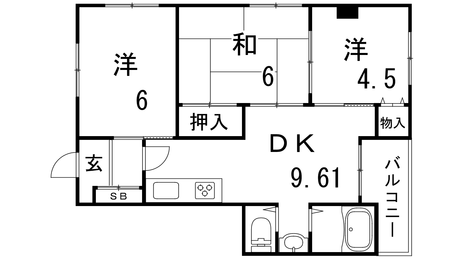 - DK9.61帖、和室6帖、洋室6帖、洋室4.5帖