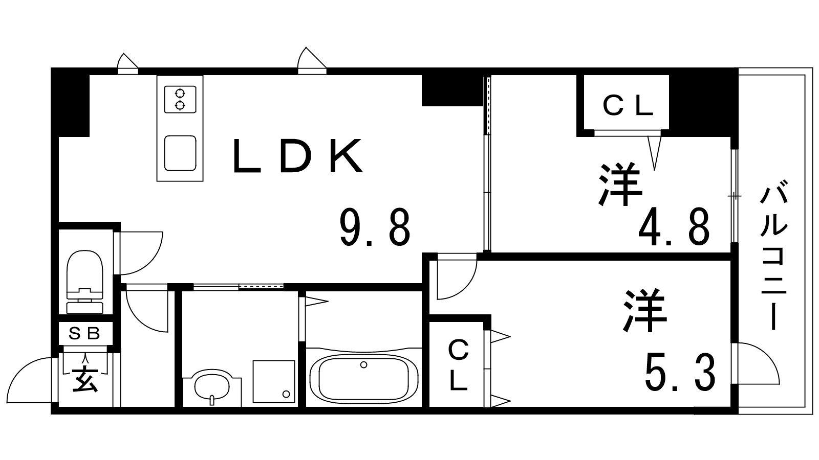 - LDK9.8帖、洋室5.3帖、洋室4.8帖