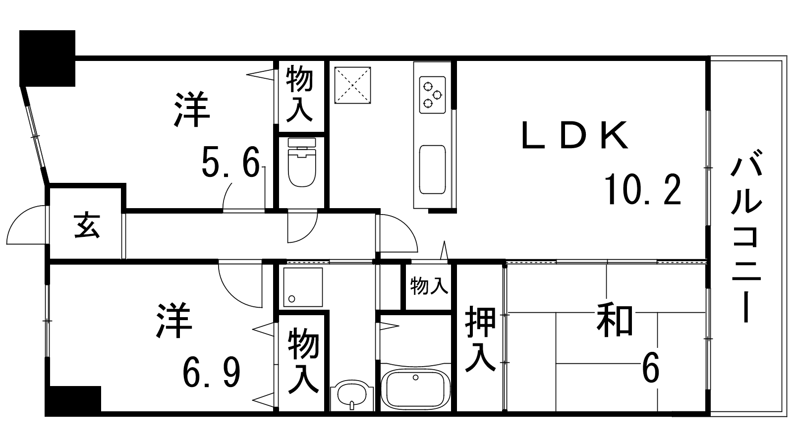 - LDK10.2帖、和室6帖、洋室6.9帖、洋室5.6帖