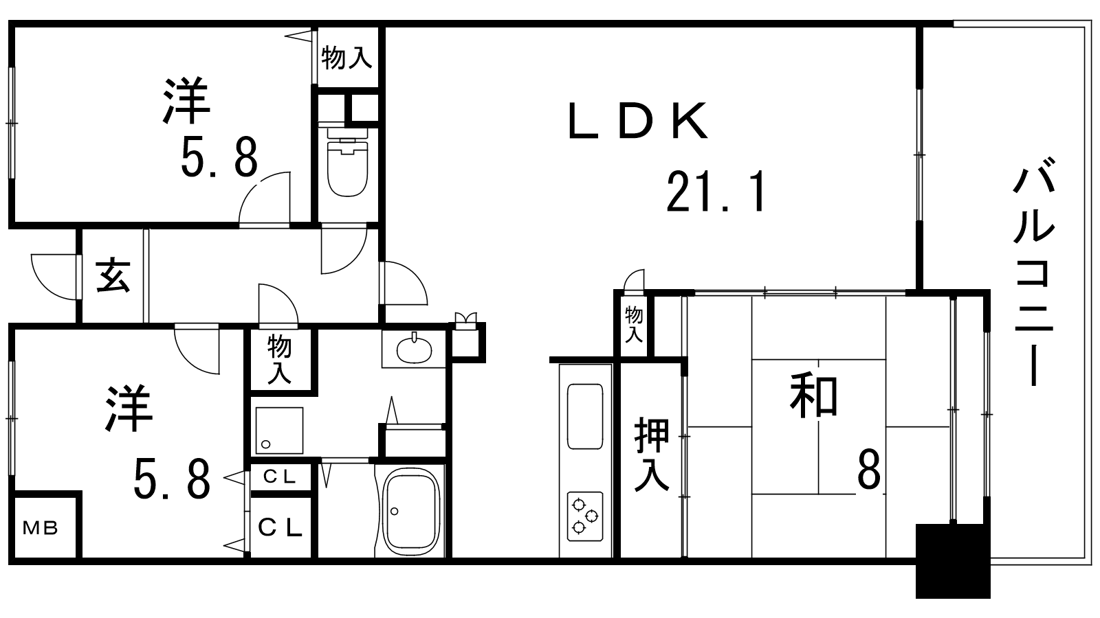 - LDK21.1帖、和室8帖、洋室5.8帖、洋室5.8帖