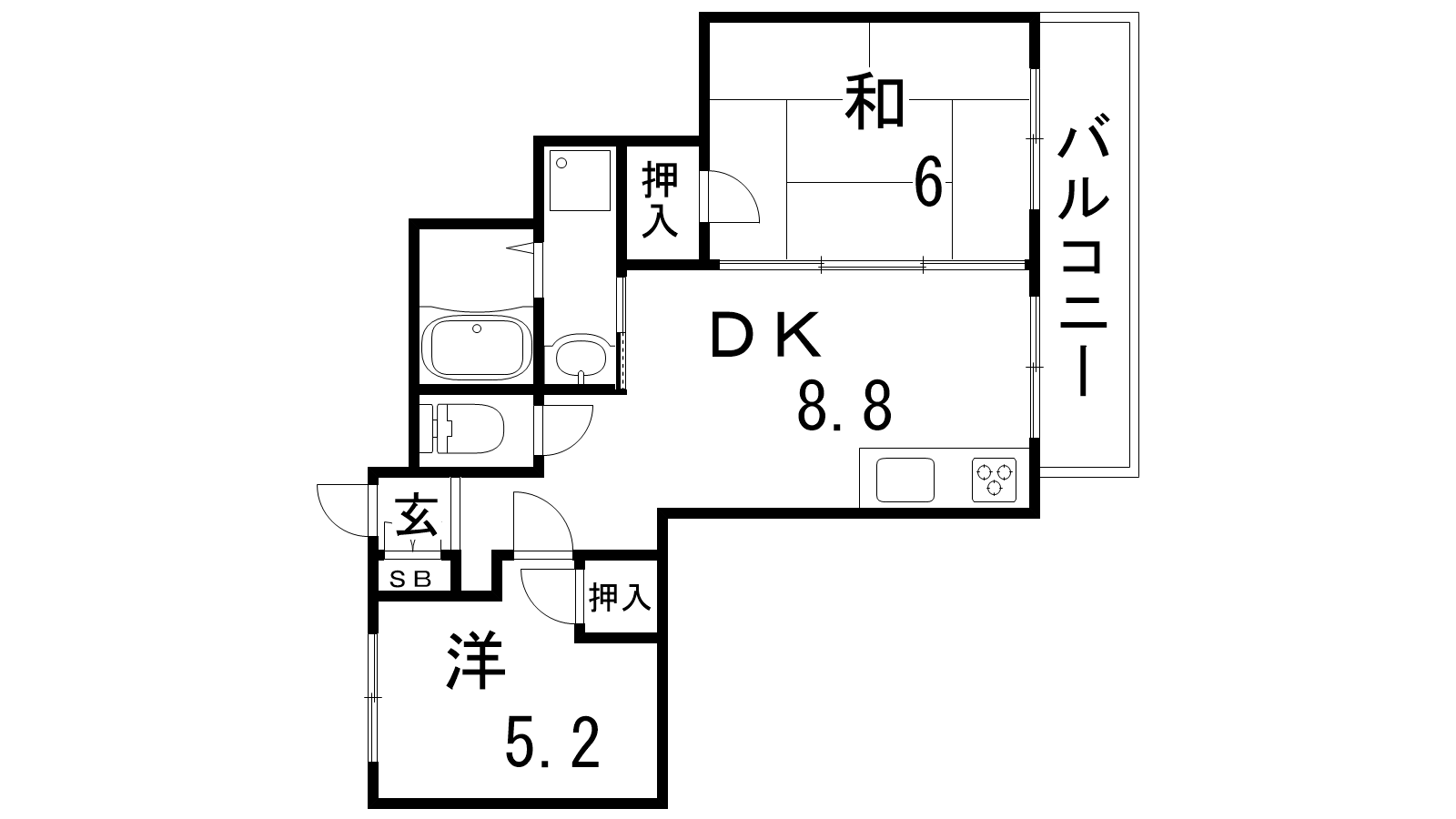 - LDK8.8帖、和室6帖、洋室5.2帖