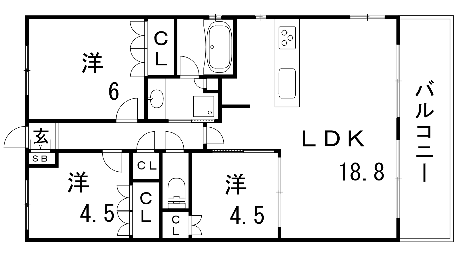 - LDK18.8帖、洋室4.5帖、洋室4.5帖、洋室6帖