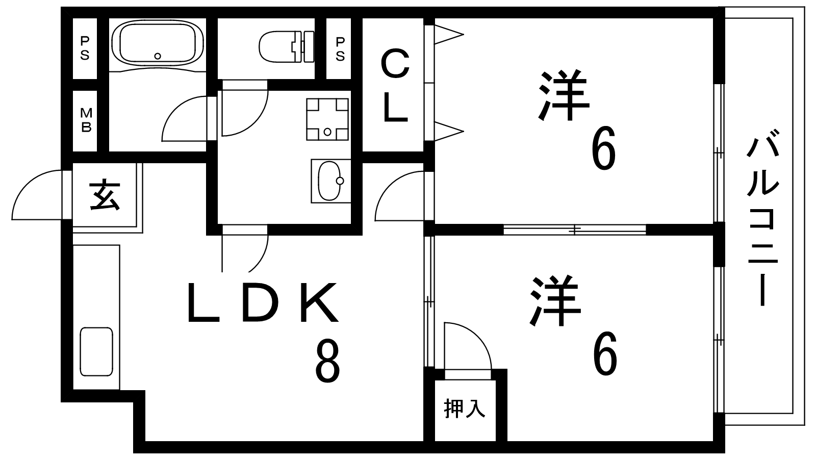 - LDK8帖、洋室6帖、洋室6帖