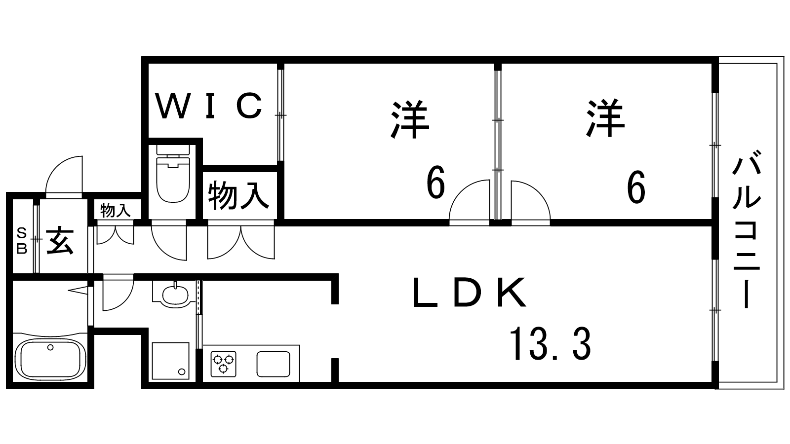 - LDK13.3帖、洋室6帖、洋室6帖