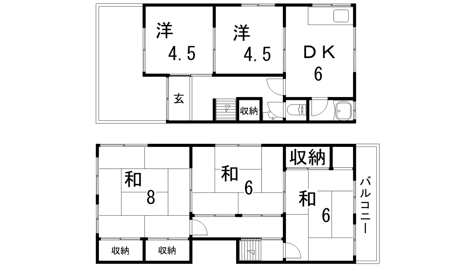 - DK6帖、洋室4.5帖、洋室4.5帖、和室6帖、和室6帖、和室8帖