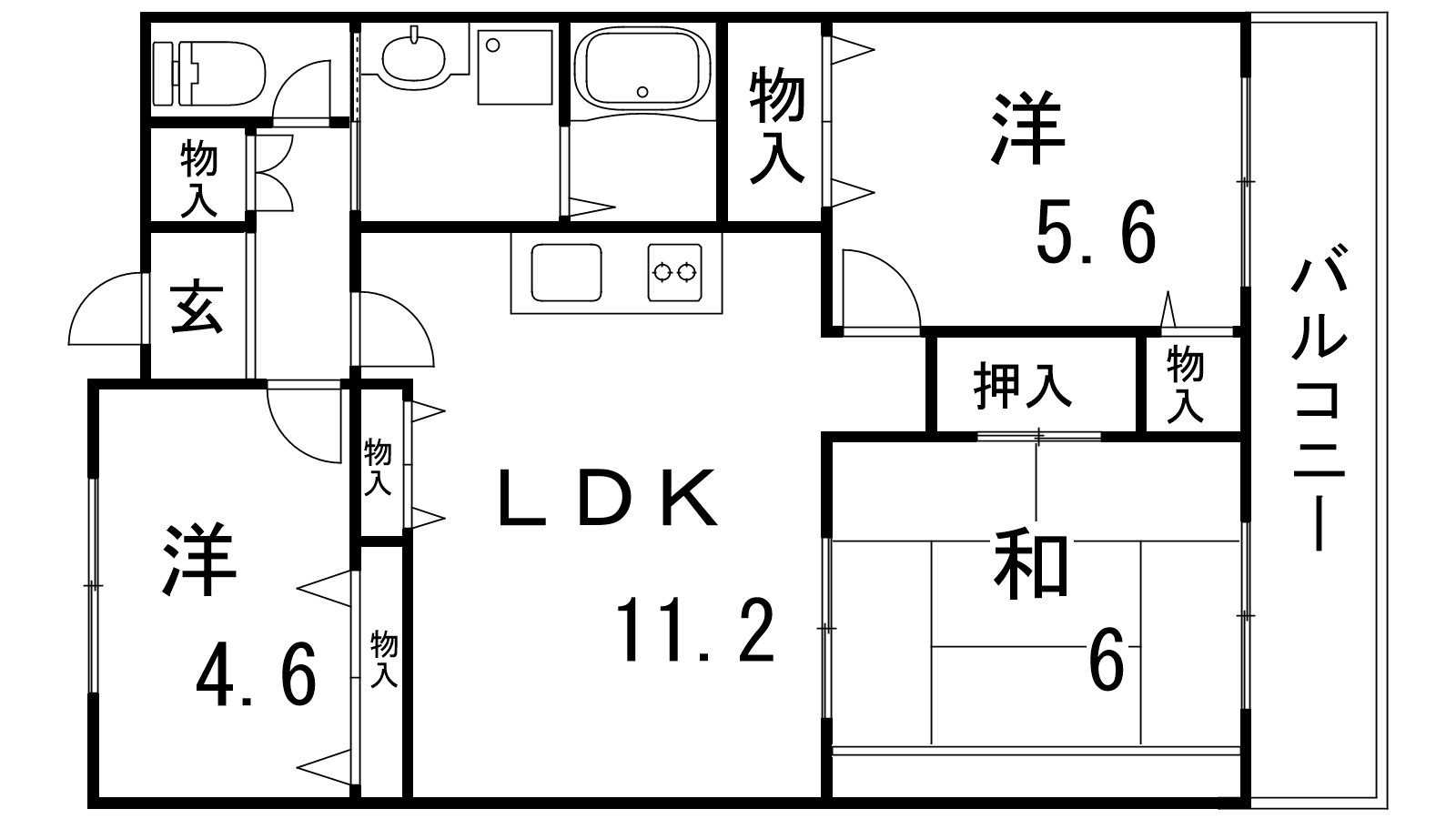 - LDK11.2帖、洋室5.6帖、洋室4.6帖、和室6帖