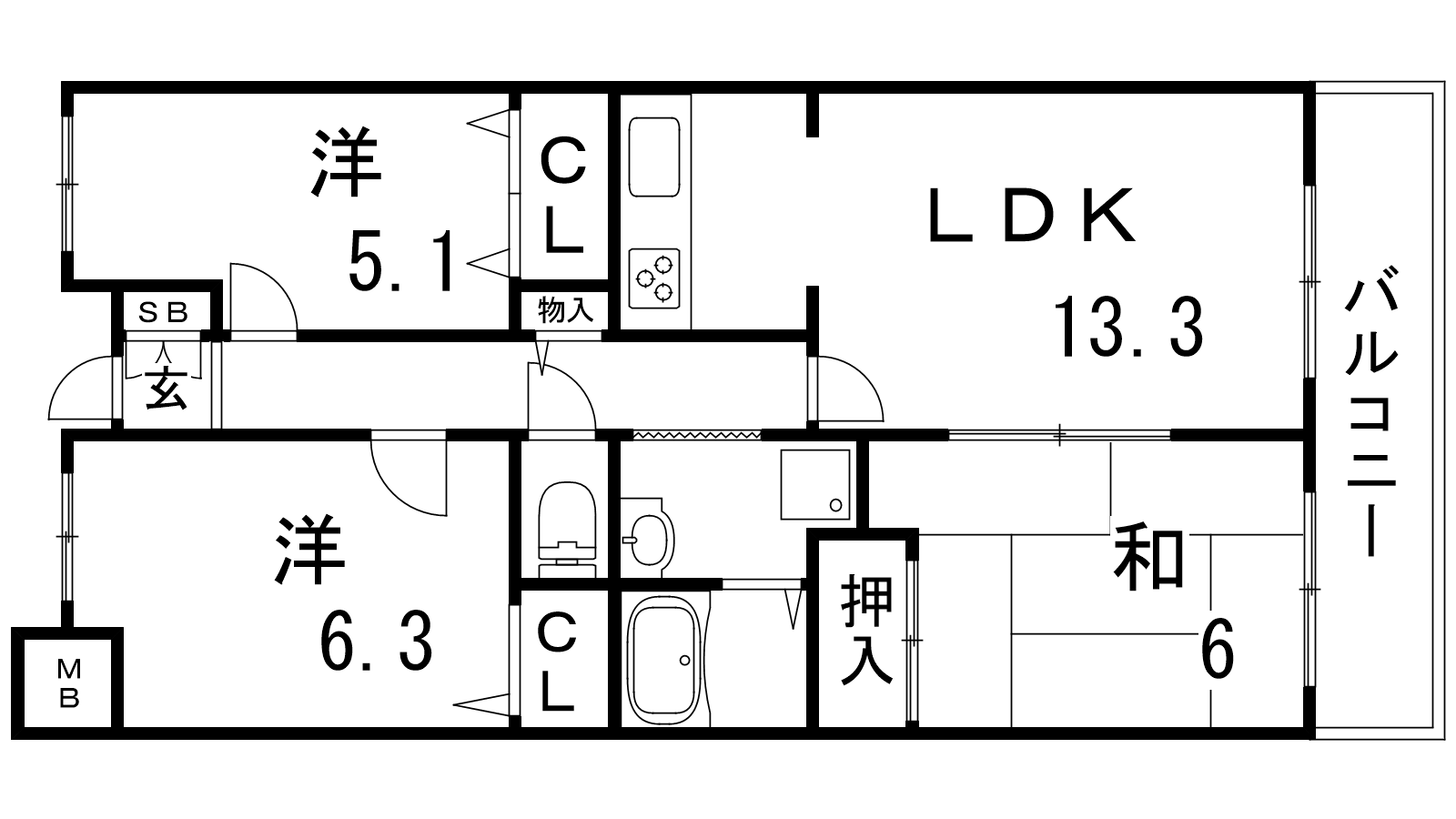 - DK13.3帖、洋室6.3帖、洋室5.1帖、和室6帖