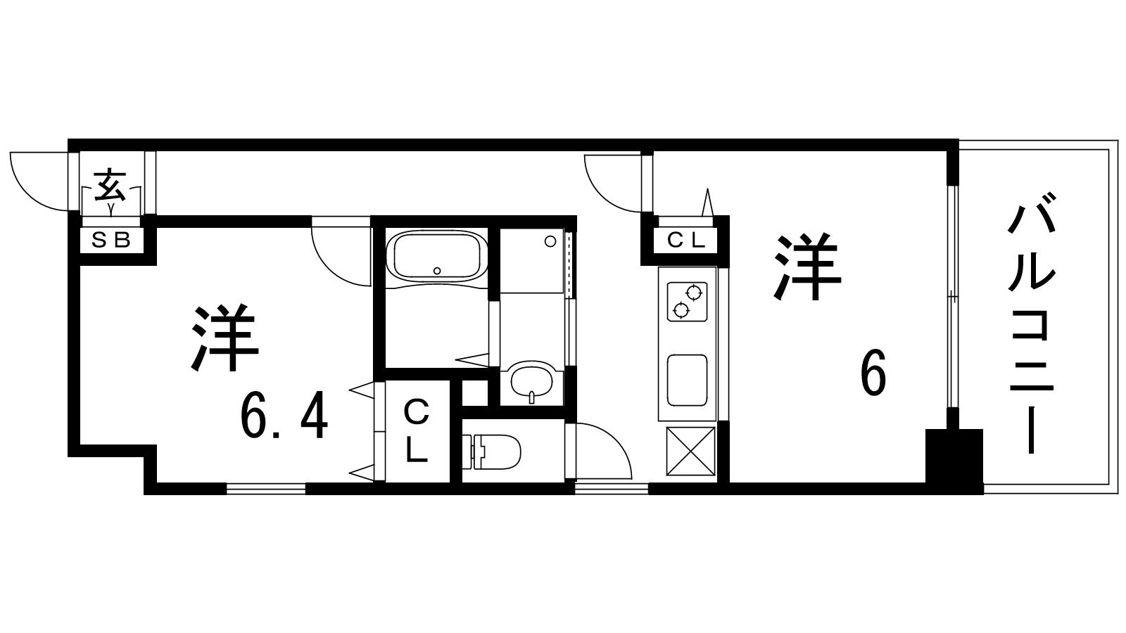 - K2帖、洋室6.4帖、洋室6帖
