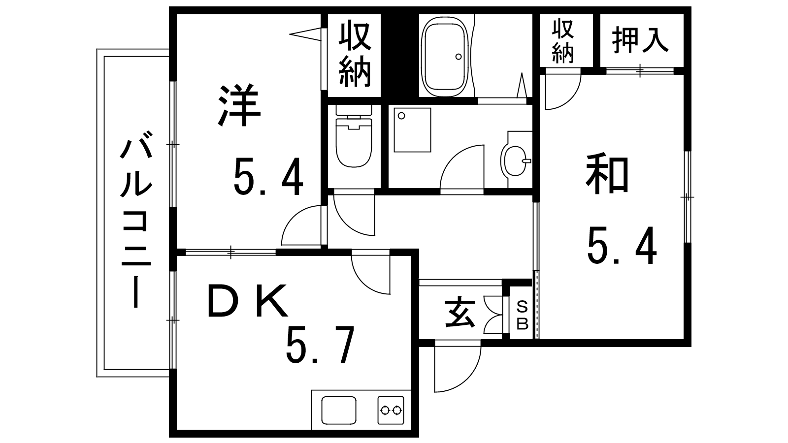 - DK5.7帖、和室5.4帖、洋室5.4帖