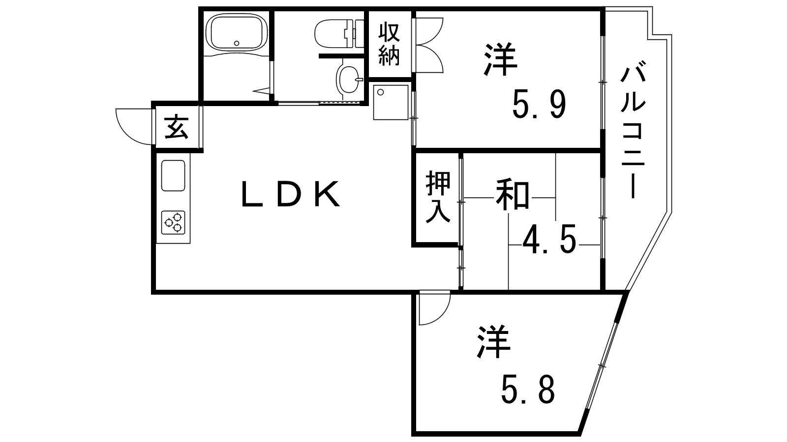 - 洋室5.9帖、洋室5.8帖、和室4.5帖