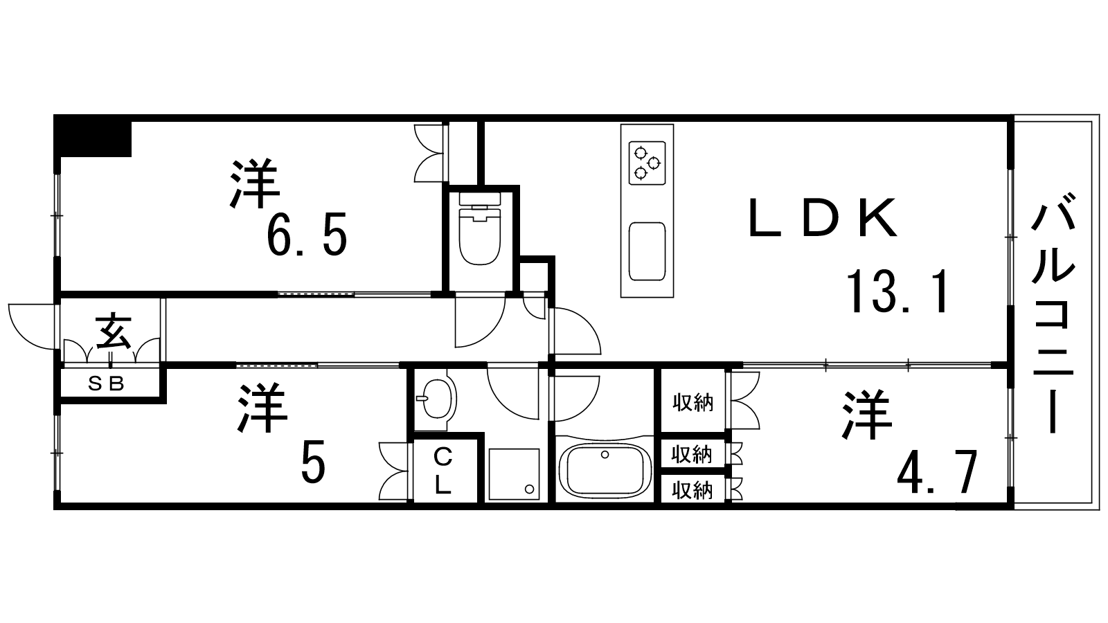 - LDK13.1帖、洋室6.5帖、洋室5帖、洋室4.7帖