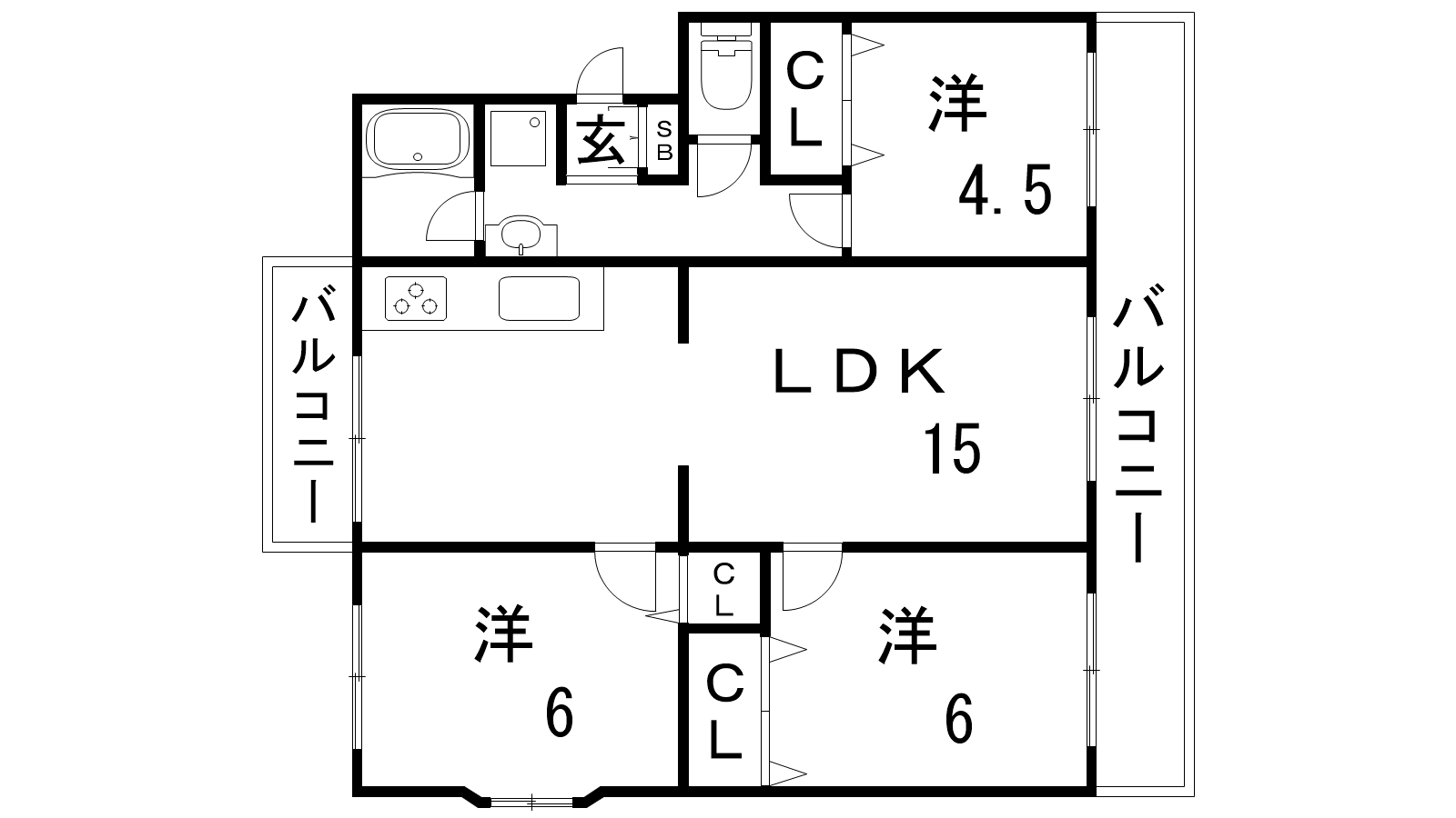 - LDK15帖、洋室6帖、洋室6帖、洋室4.5帖