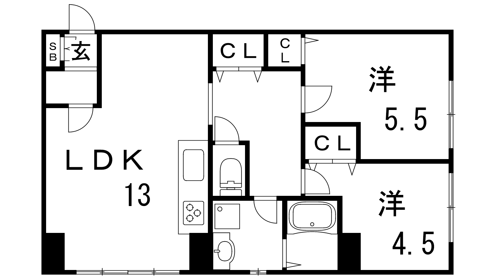 - LDK13帖、洋室5.5帖、洋室4.5帖