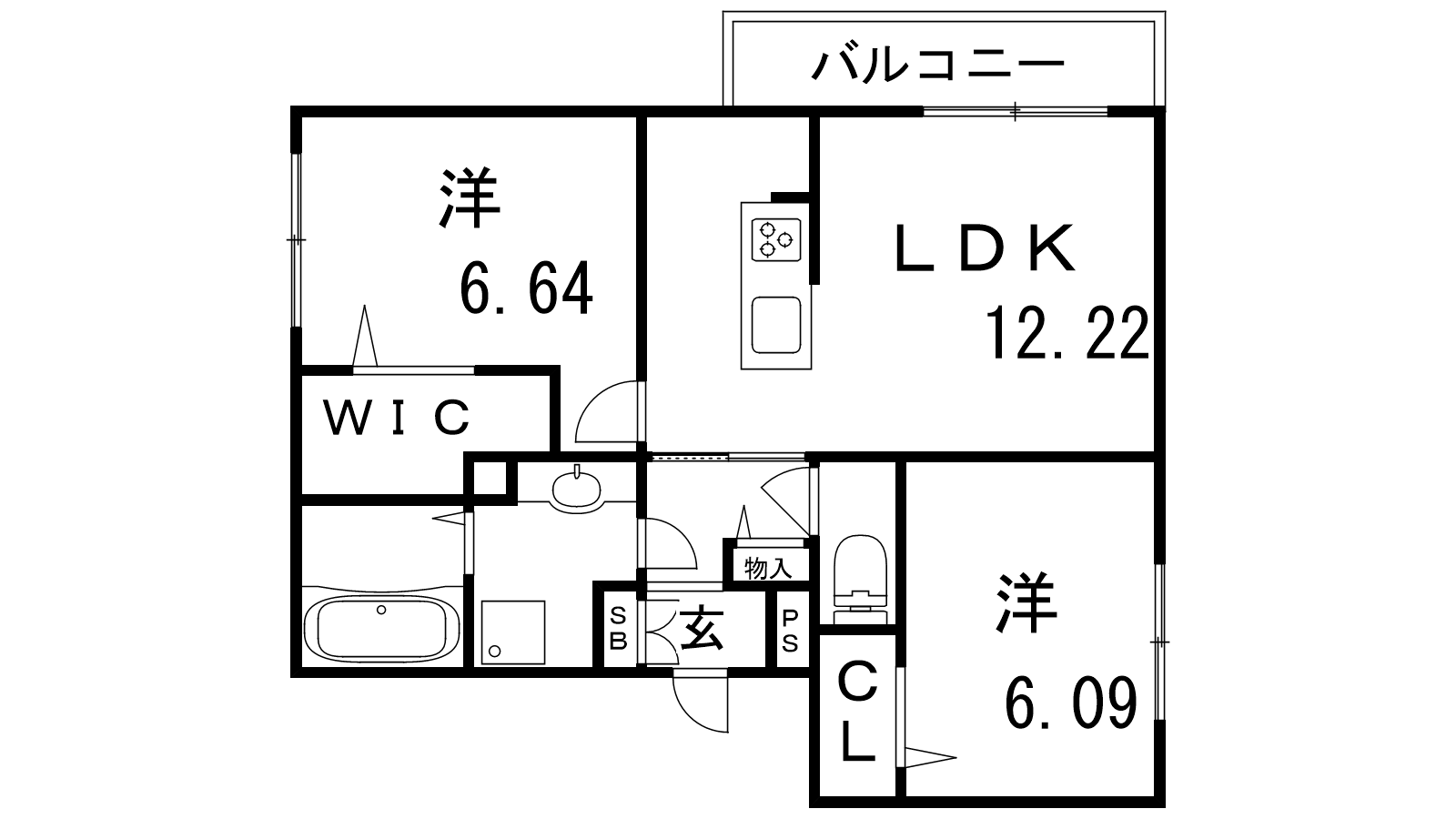- LDK12.22帖、洋室6.09帖、洋室6.64帖