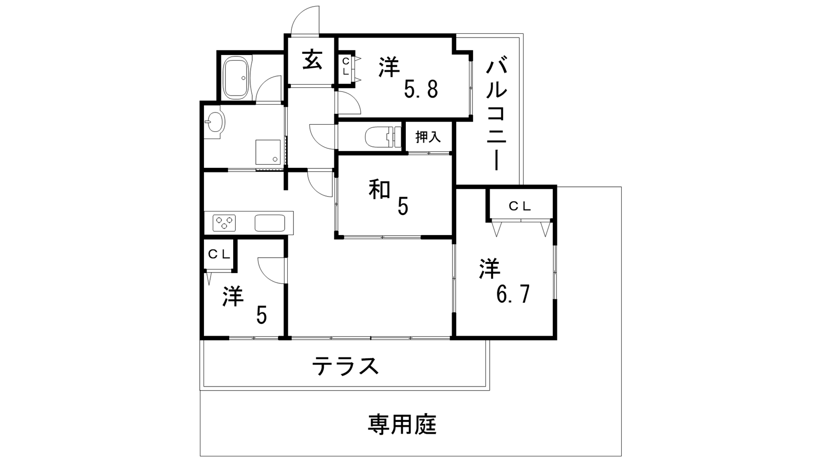 - LDK15.7帖、洋室6.7帖、和室5帖、洋室5帖、洋室5.8帖