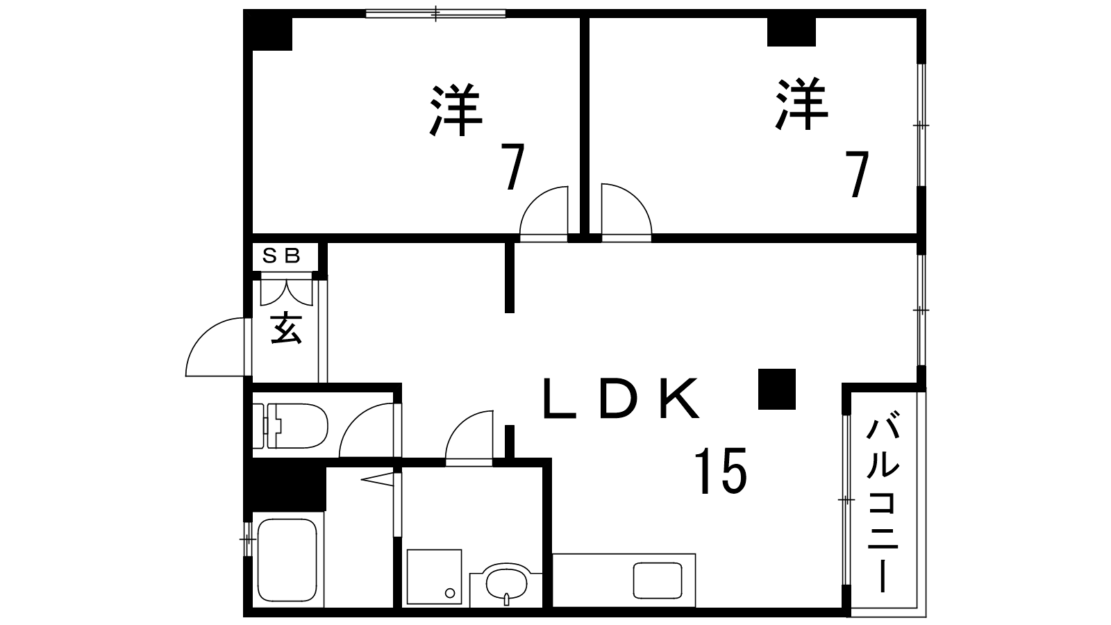- LDK15帖、洋室7帖、洋室7帖