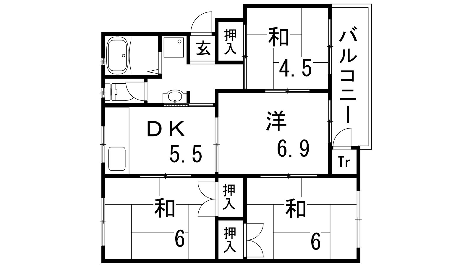 - DK5.5帖、洋室6.9帖、和室6帖、和室6帖、和室4.5帖