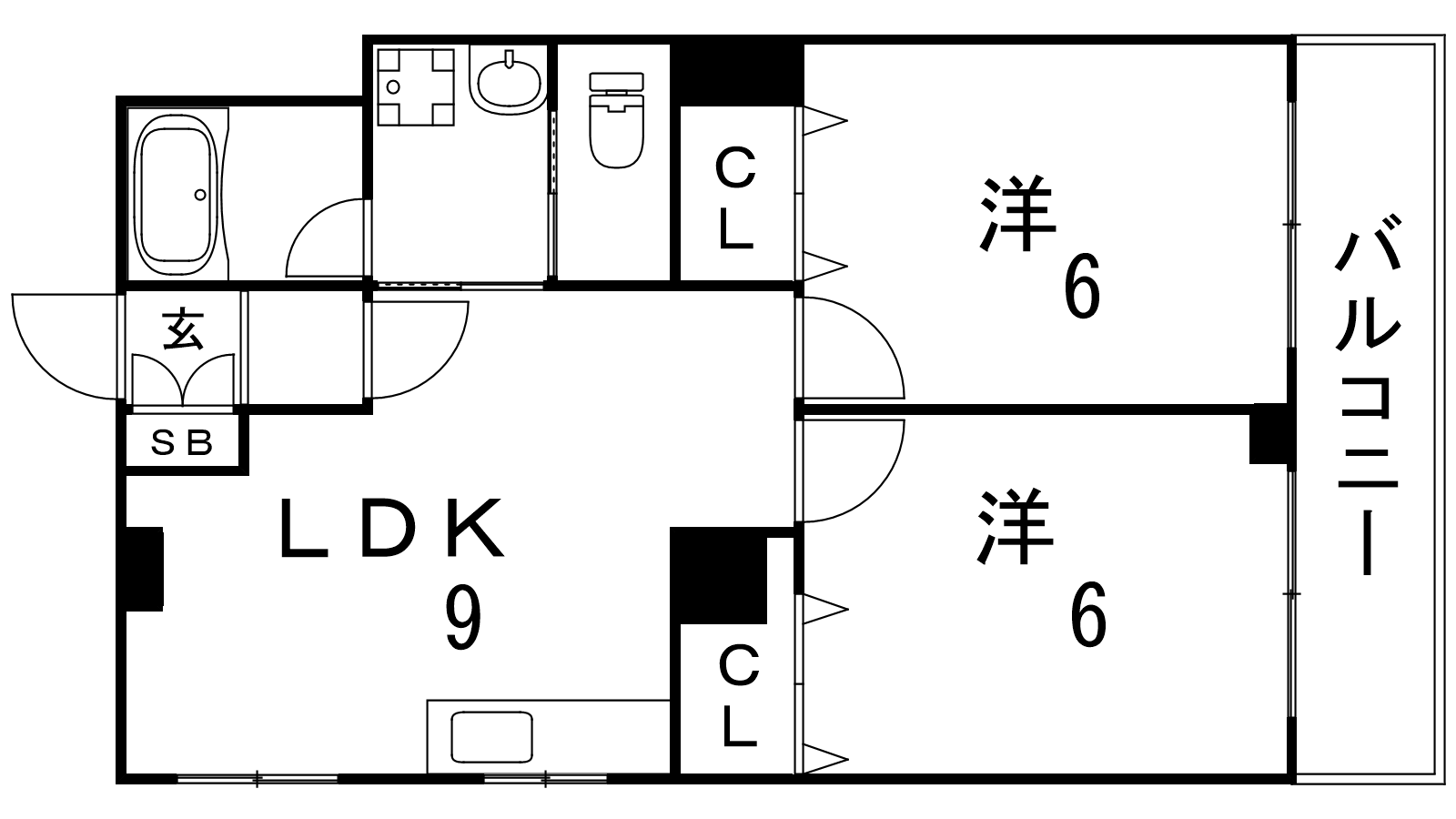 - LDK9帖、洋室6帖、洋室6帖