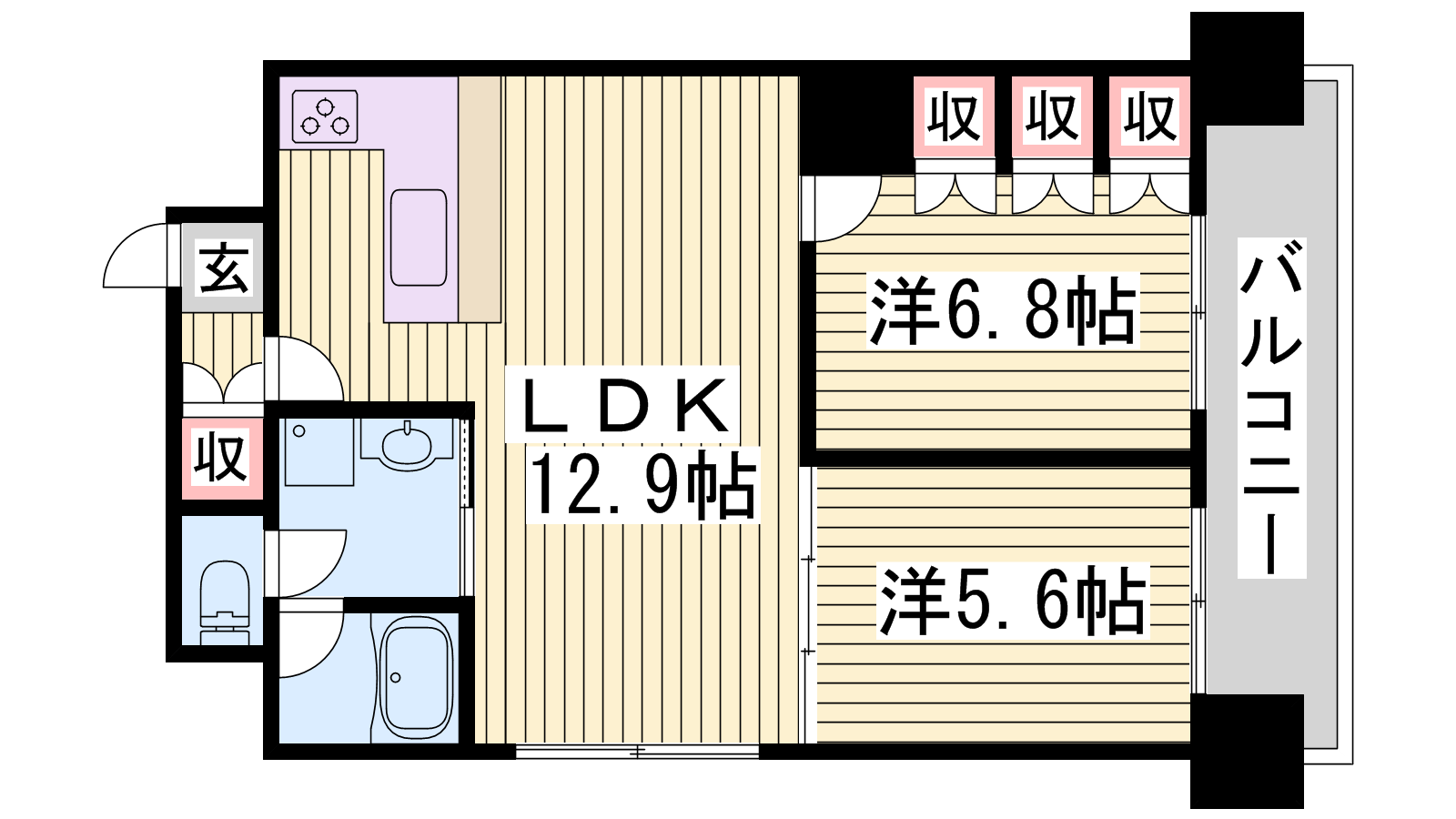 - LDK12.9帖、洋室6.8帖、洋室5.6帖