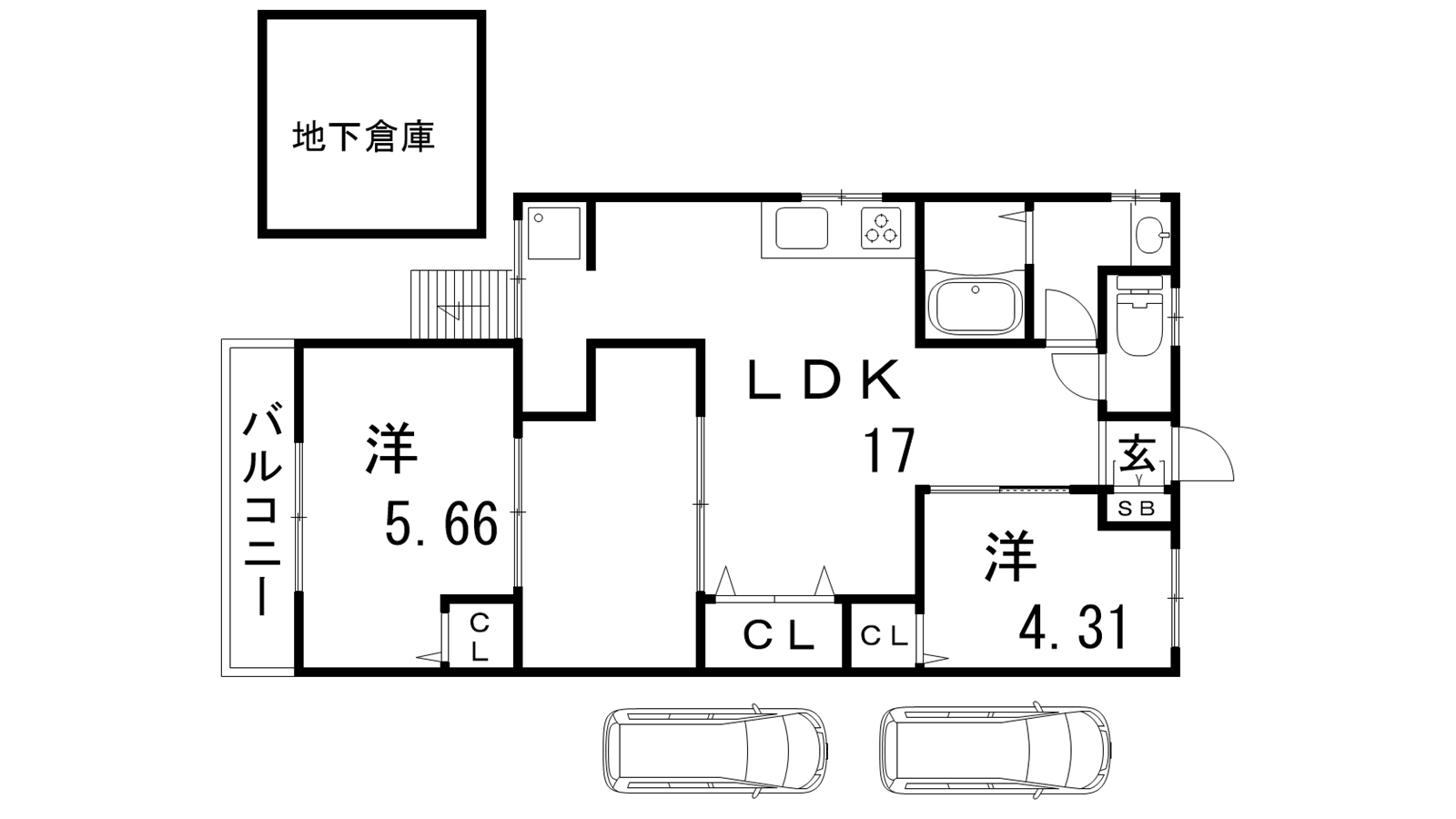 - LDK17帖、洋室4.31帖、洋室5.66帖