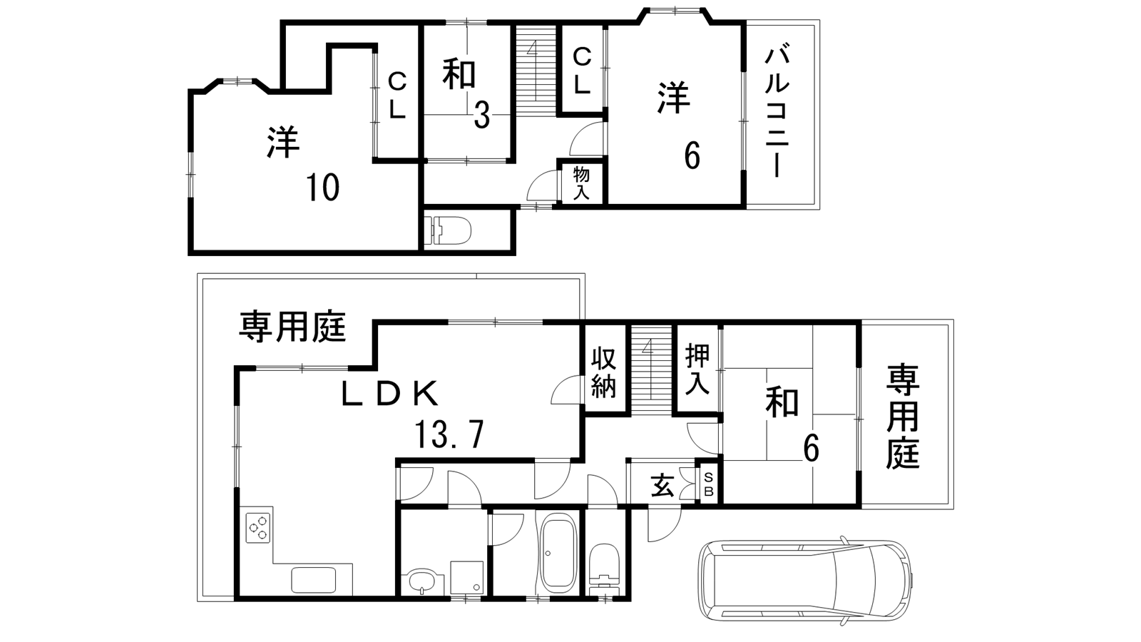 - LDK13.7帖、洋室10帖、洋室6帖、和室6帖