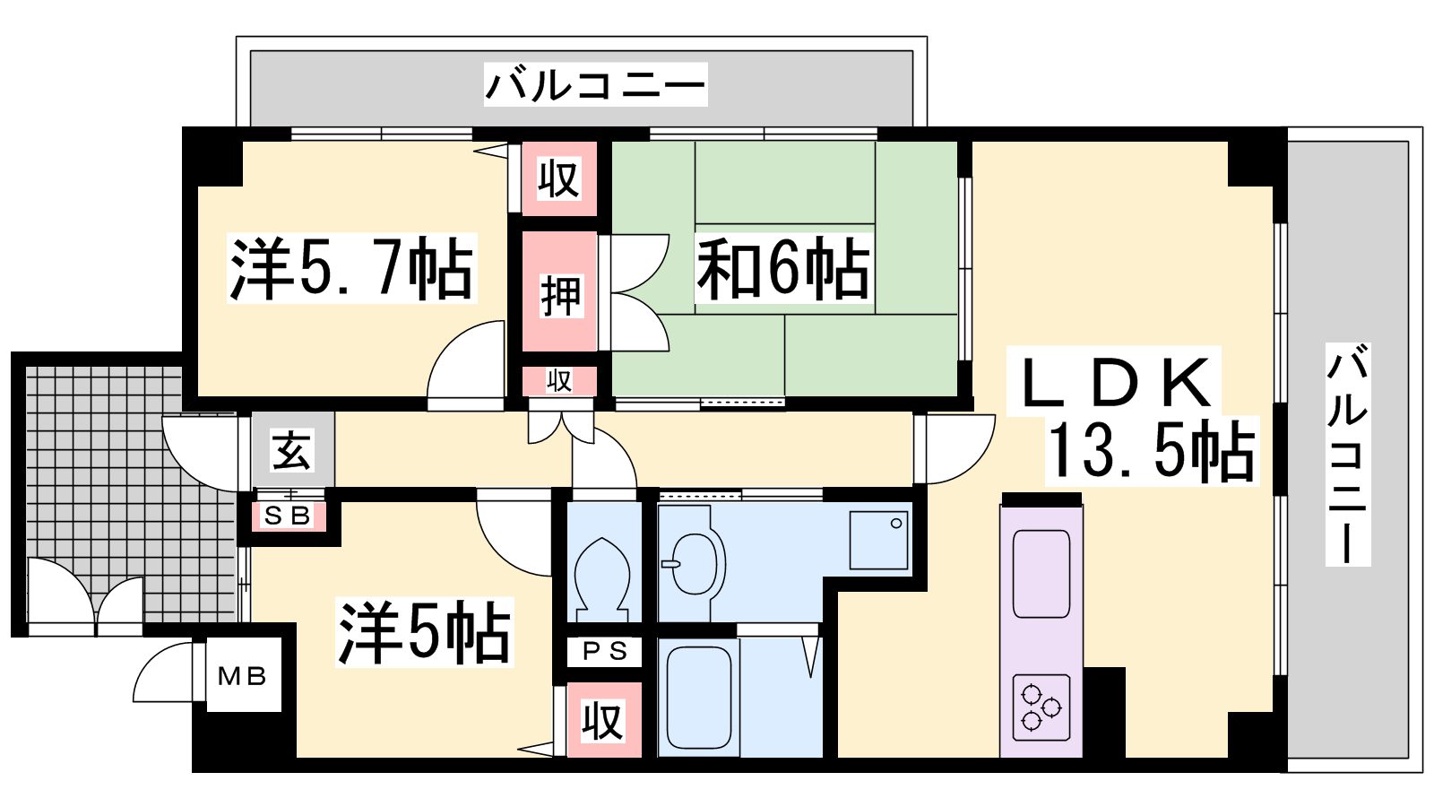 - LDK13.5帖、洋室5.7帖、洋室5帖、和室6帖