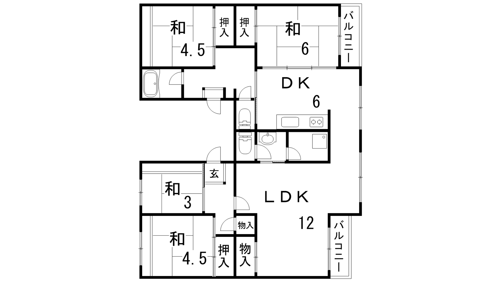 - LDK12帖、和室4.5帖、和室4.5帖、和室6帖、和室3帖