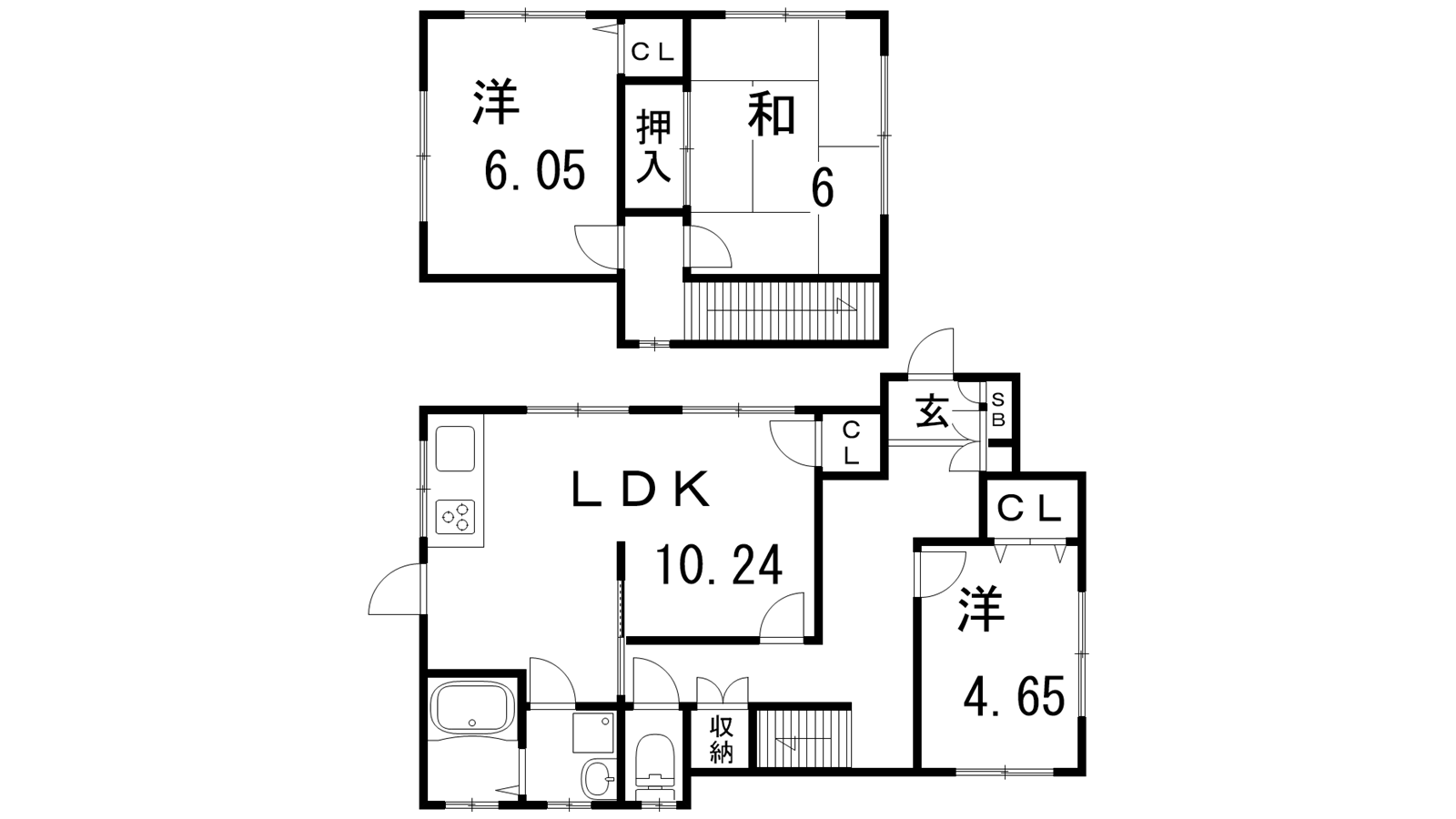 - LDK10.42帖、洋室4.65帖、洋室6.05帖、和室6帖