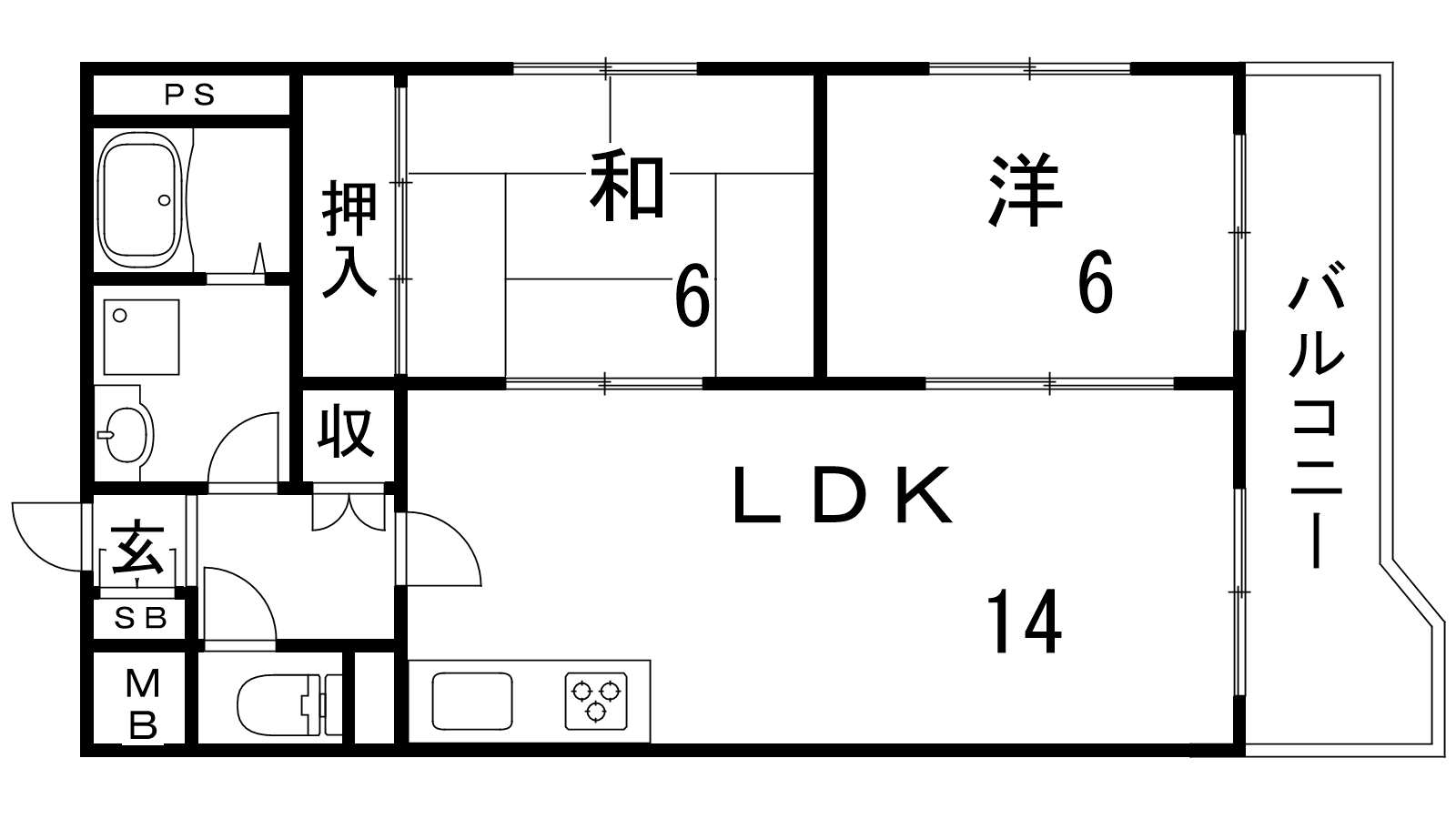 - LDK14帖、洋室6帖、和室6帖