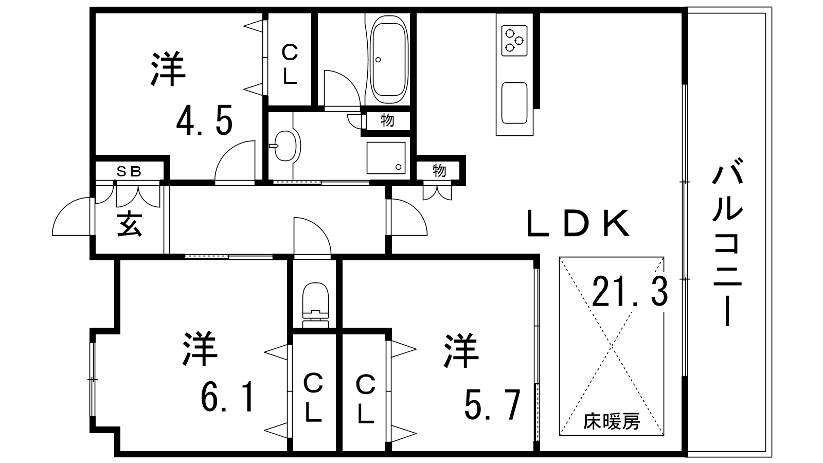 - LDK21.2帖、洋室6.1帖、洋室5.7帖、洋室4.5帖