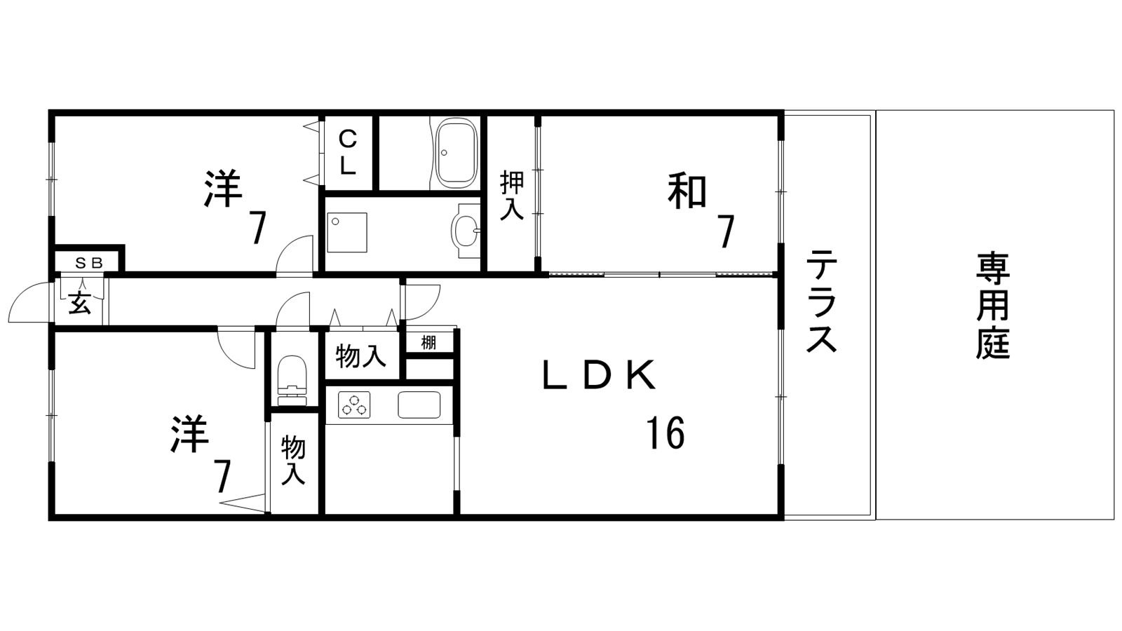 - LDK16帖、洋室7帖、洋室7帖、和室7帖