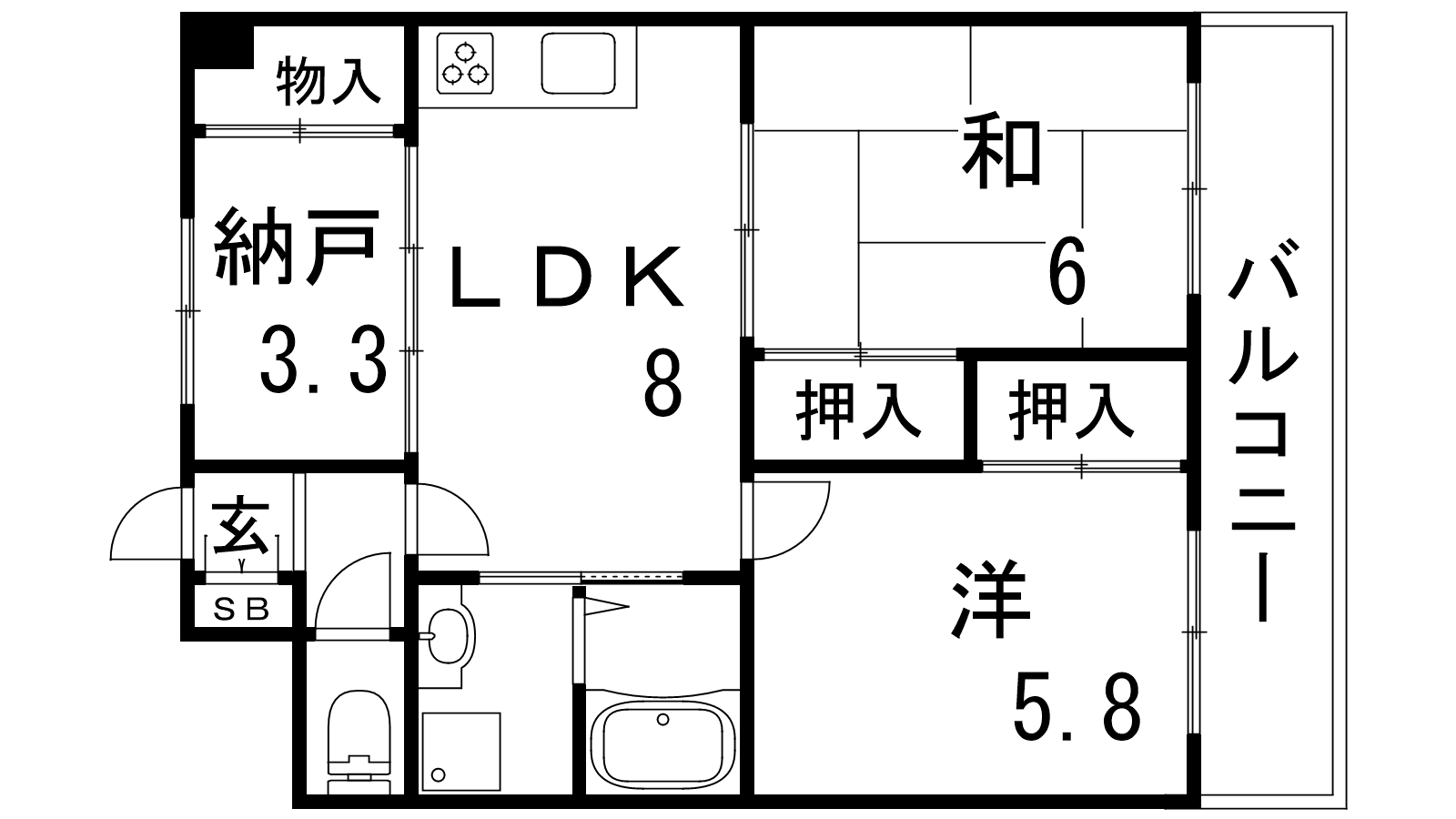 - LDK8帖、和室6帖、洋室5.8帖