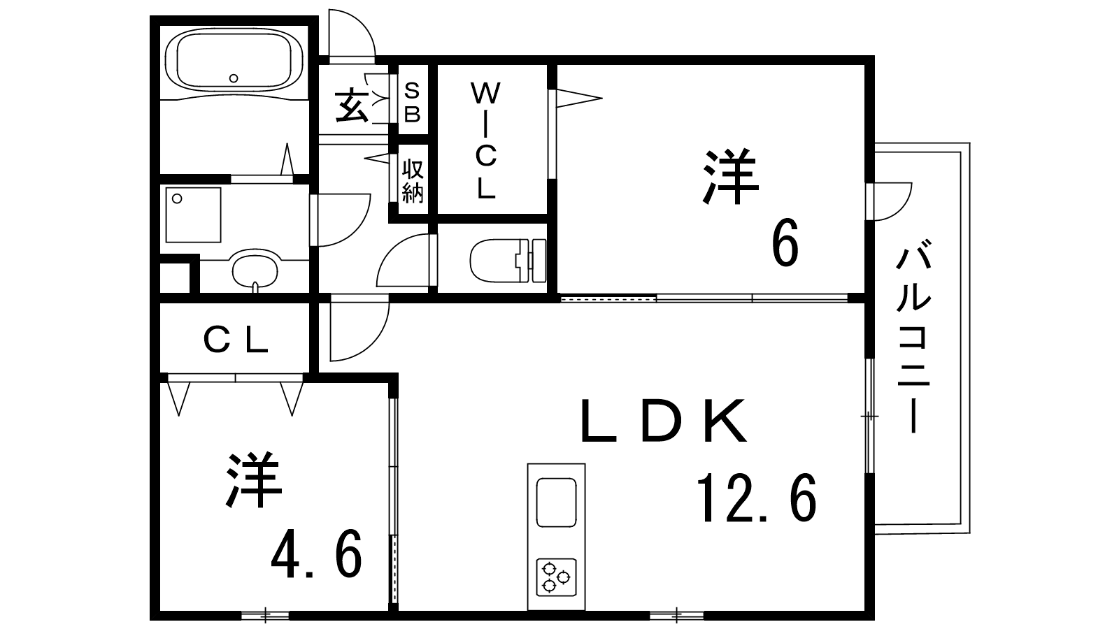 - LDK12.6帖、洋室4.6帖、洋室6帖