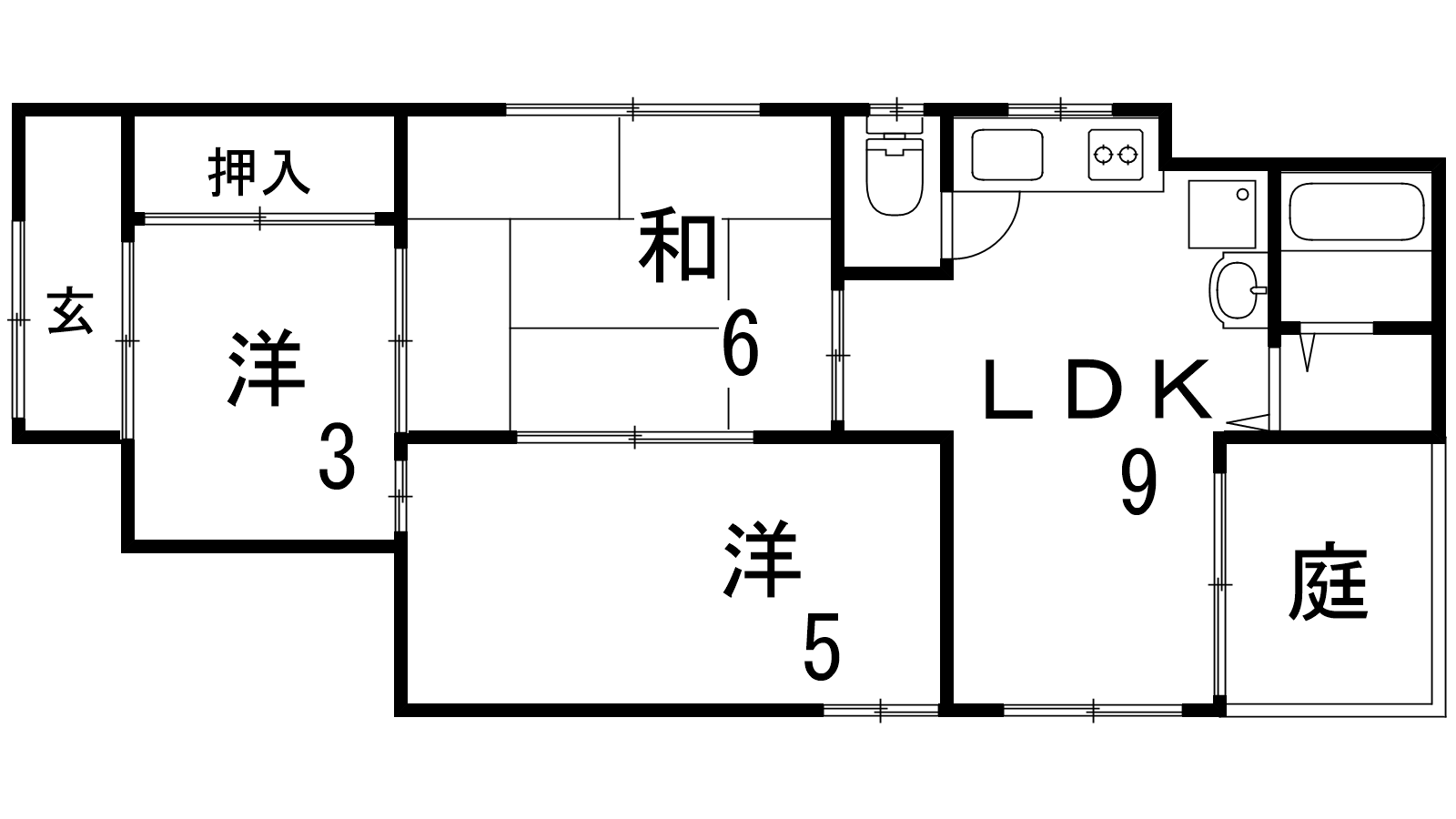 - LDK9帖、洋室5帖、洋室3帖、和室6帖