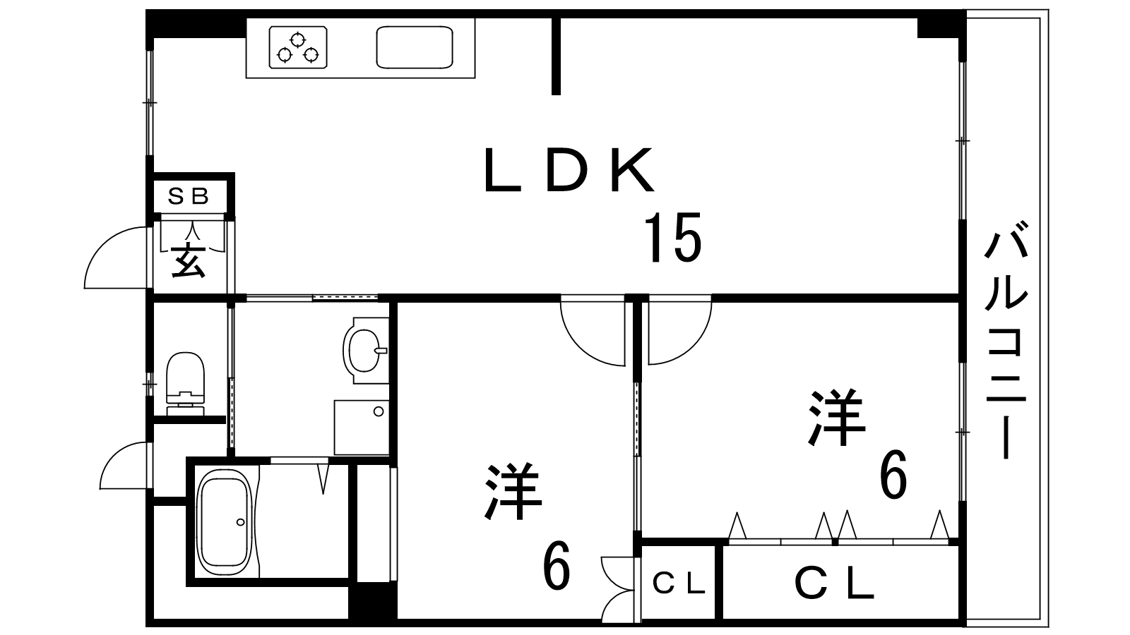 - LDK15帖、洋室6帖、洋室6帖