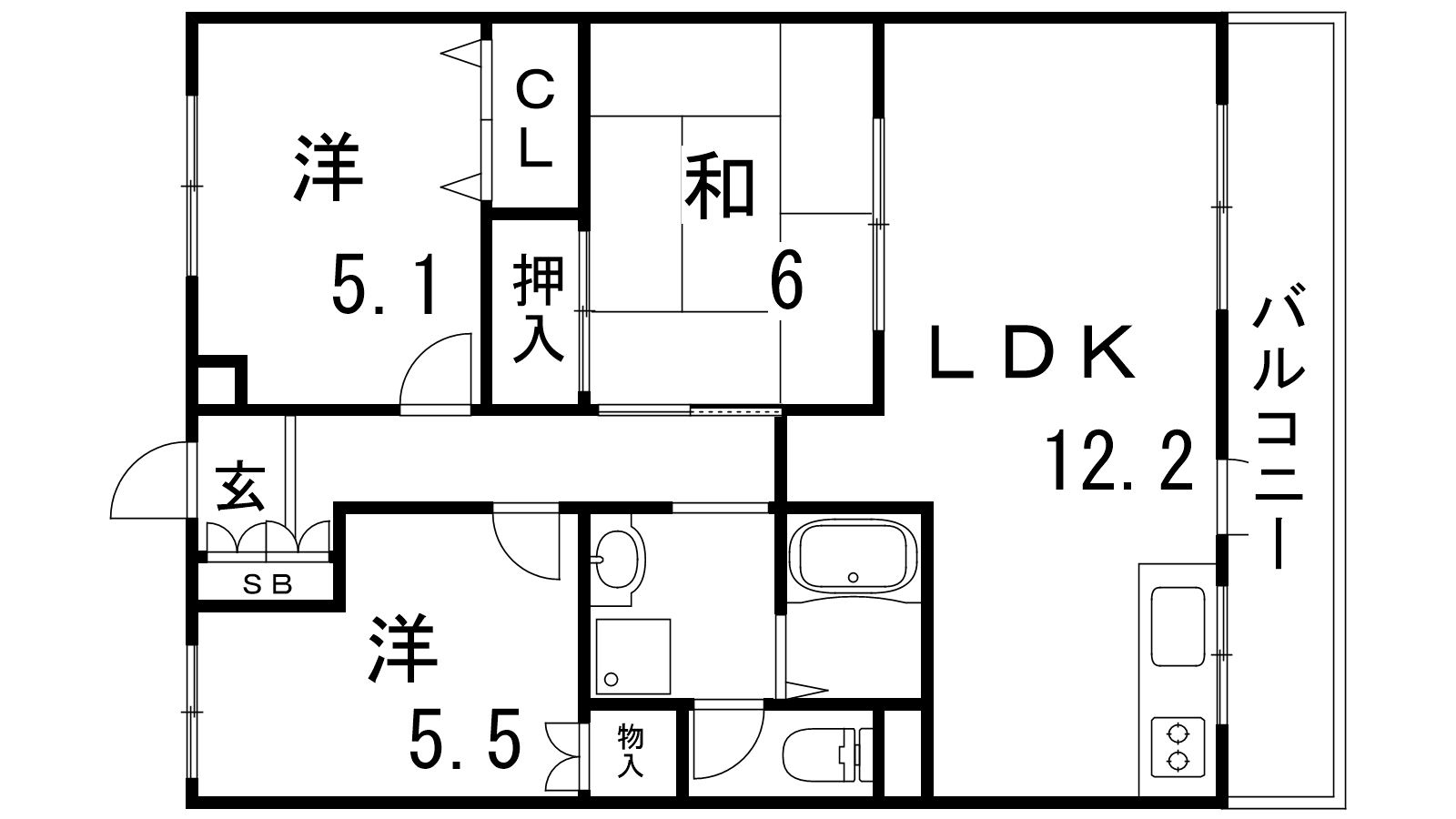 - LDK12.3帖、洋室5.5帖、洋室5.1帖、和室6帖