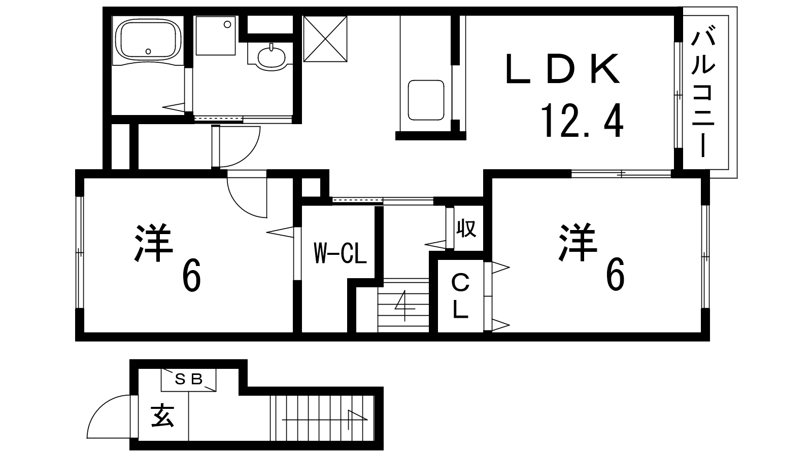 - LDK12.4帖、洋室6帖、洋室6帖