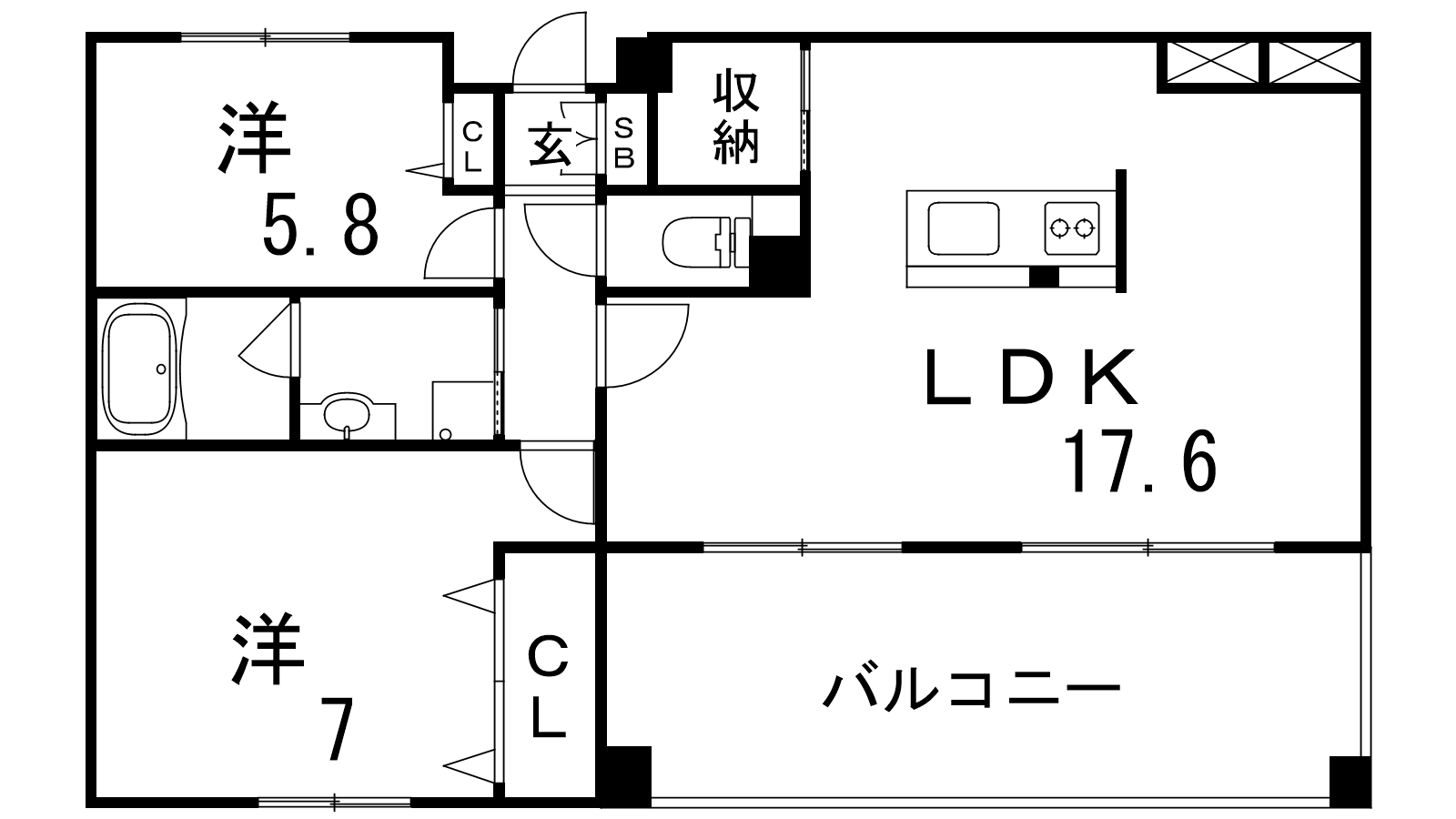 - LDK17.6帖、洋室7帖、洋室5.8帖