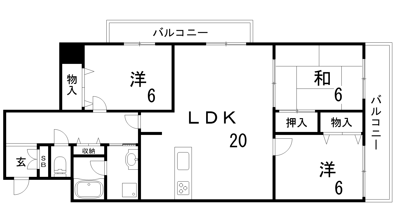 - LDK20帖、洋室6帖、洋室6帖、和室6帖