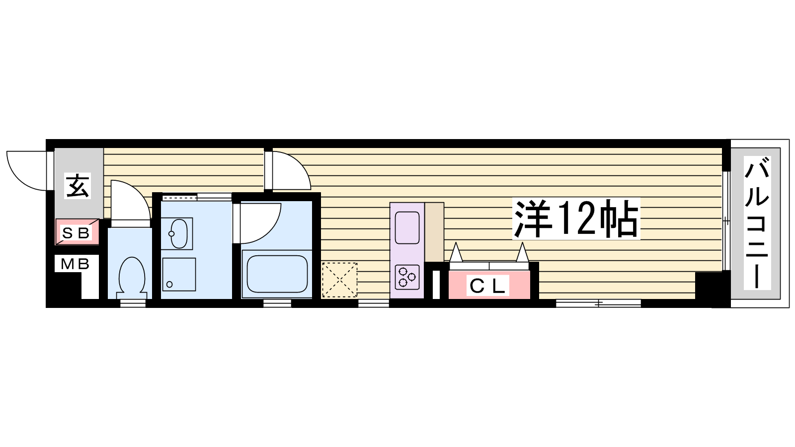 カウンターキッチンの広々12帖ワンルーム バス・トイレ・洗面の3点セパレート