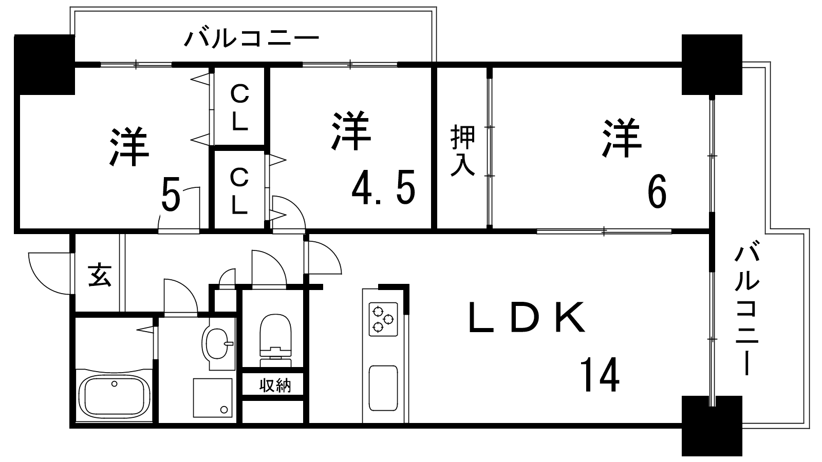 - LDK14帖、洋室5帖、洋室4.5帖、洋室6帖