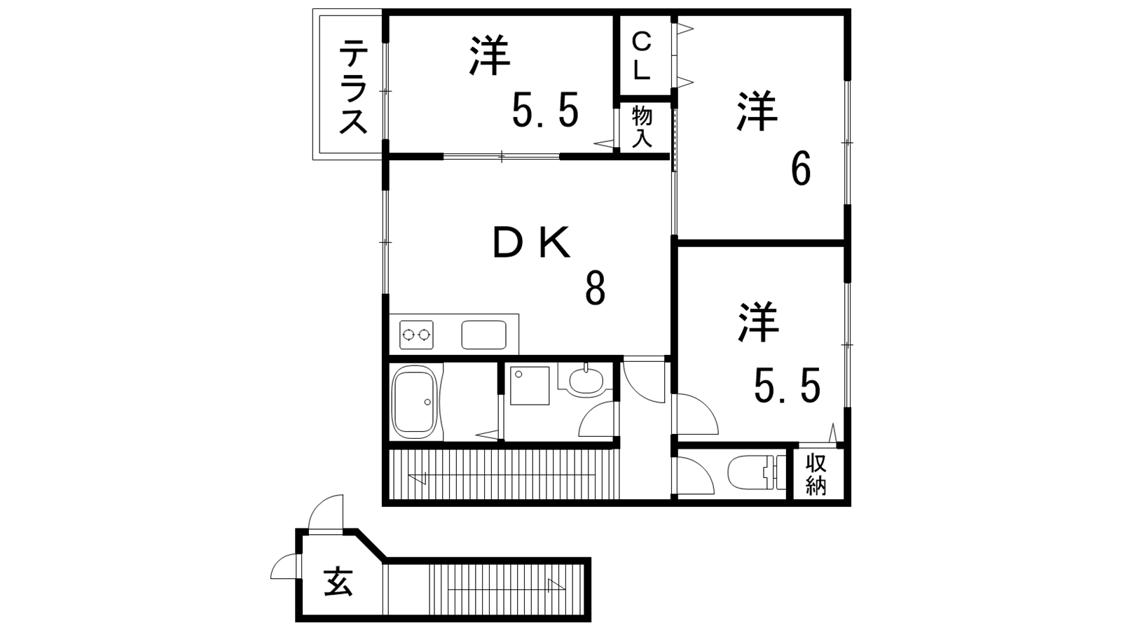 - DK8帖、洋室5.5帖、洋室5.5帖、洋室6帖