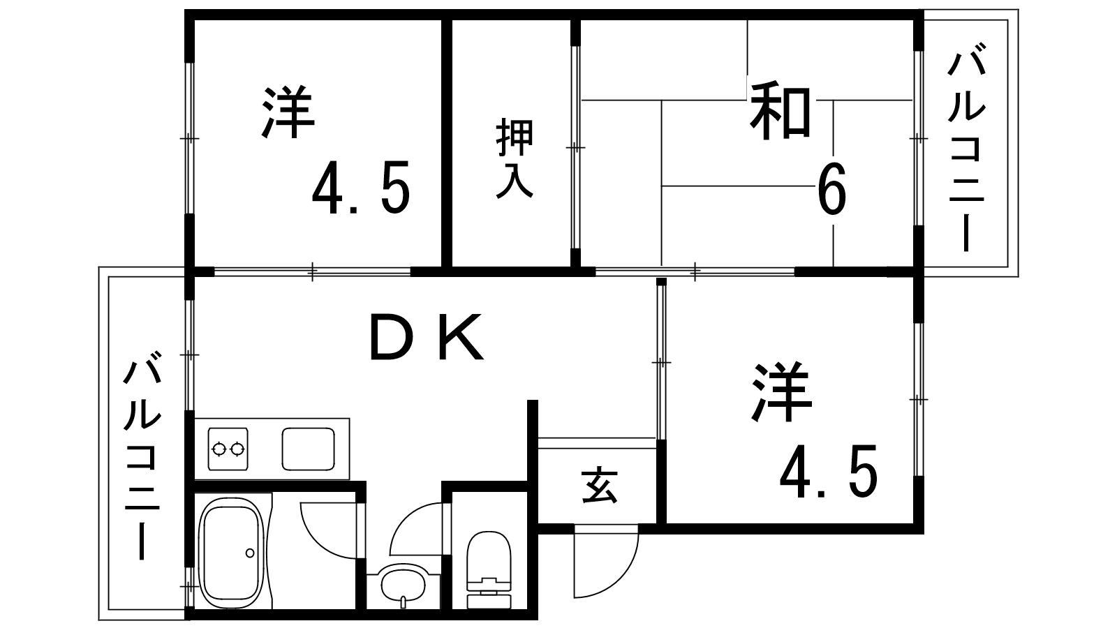 - DK6帖、洋室4.5帖、洋室4.5帖、和室6帖