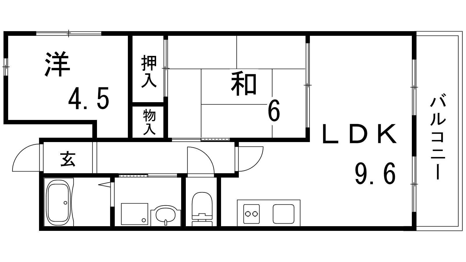 - LDK9.6帖、洋室4.5帖、和室6帖
