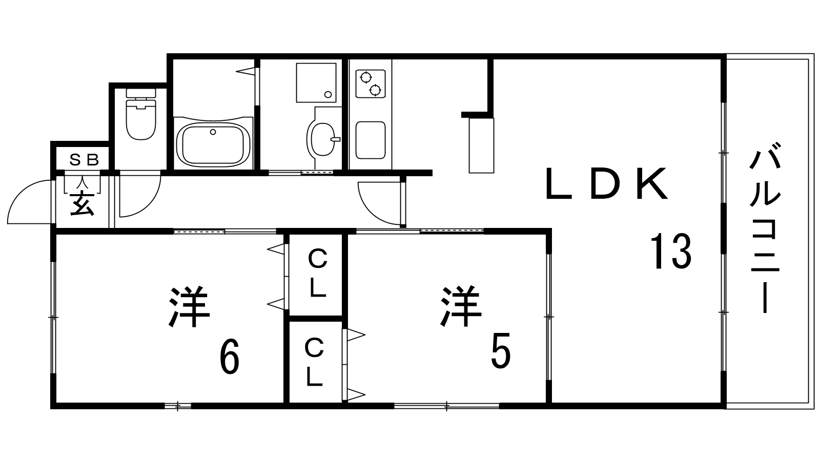 - LDK13帖、洋室6帖、洋室5帖